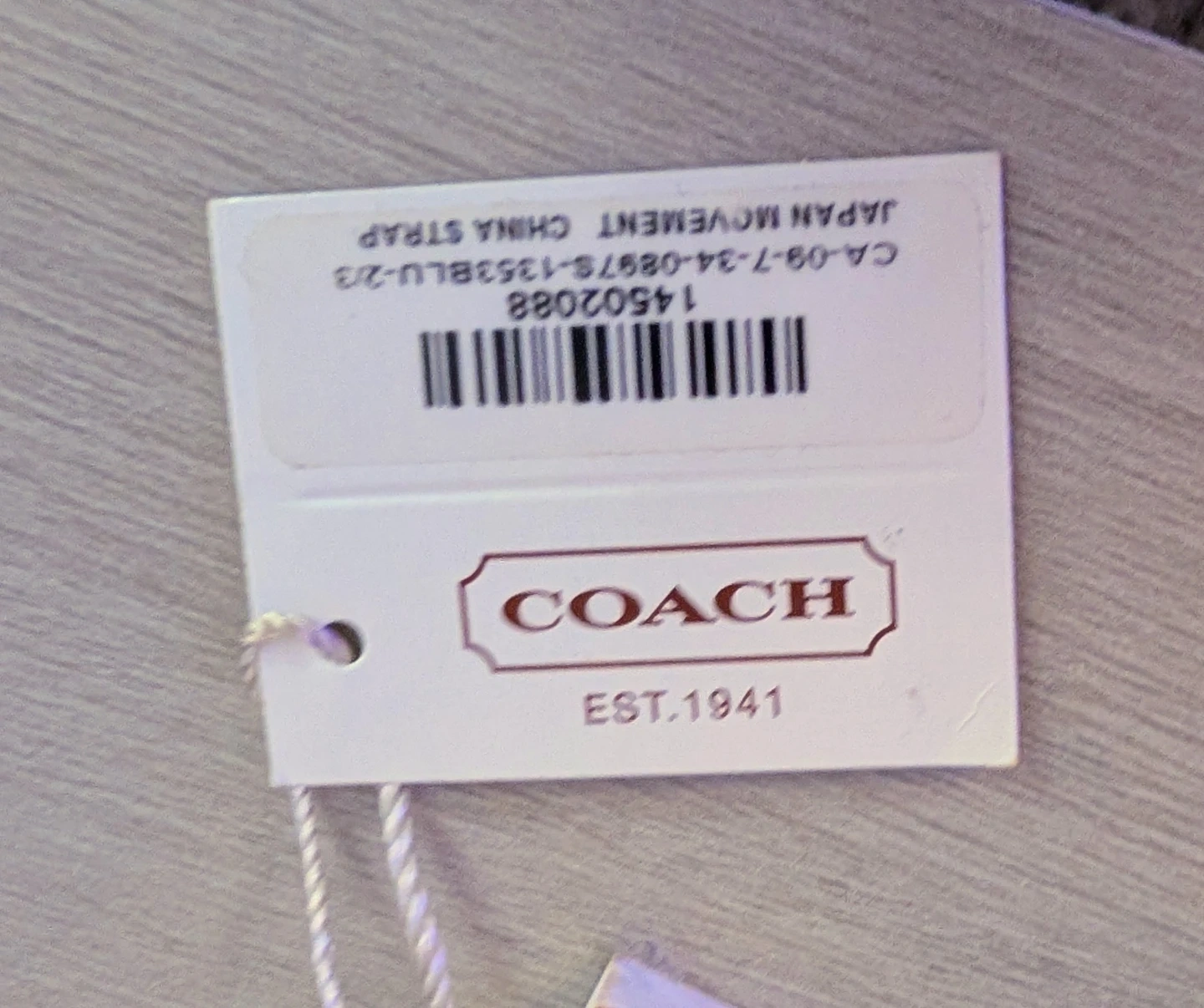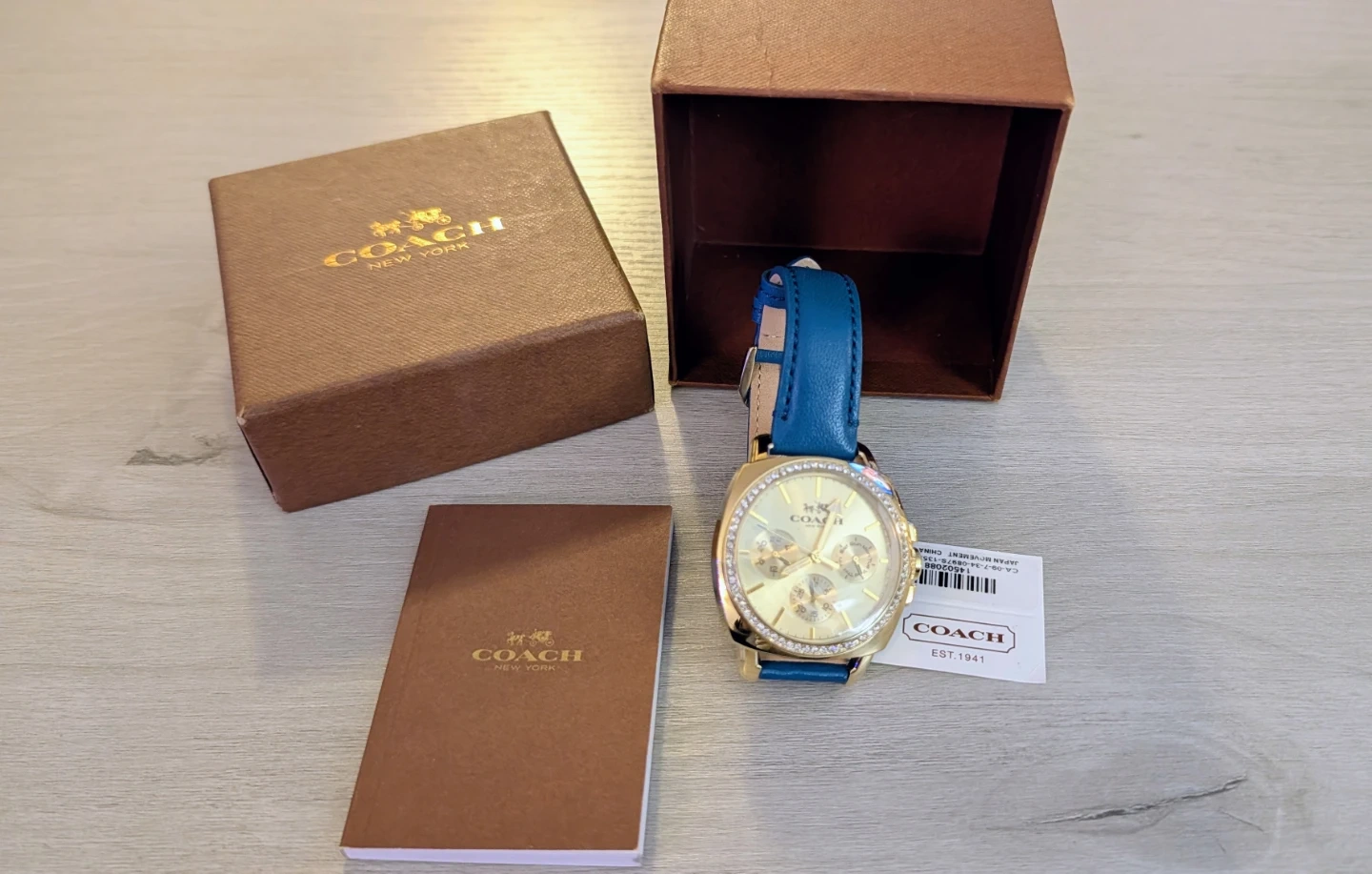 Selling a beautiful Coach women's watch with a striking blue leather strap and a gold-tone case. It comes with the original box and booklet. The tag shows the original price was $228. The model number is 14502088. A stylish accessory to elevate any outfit!