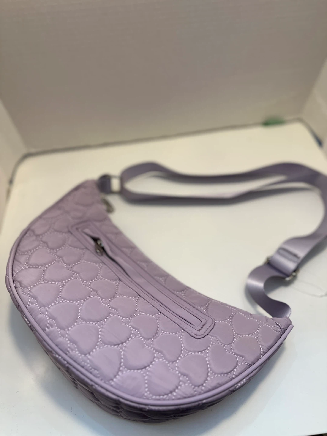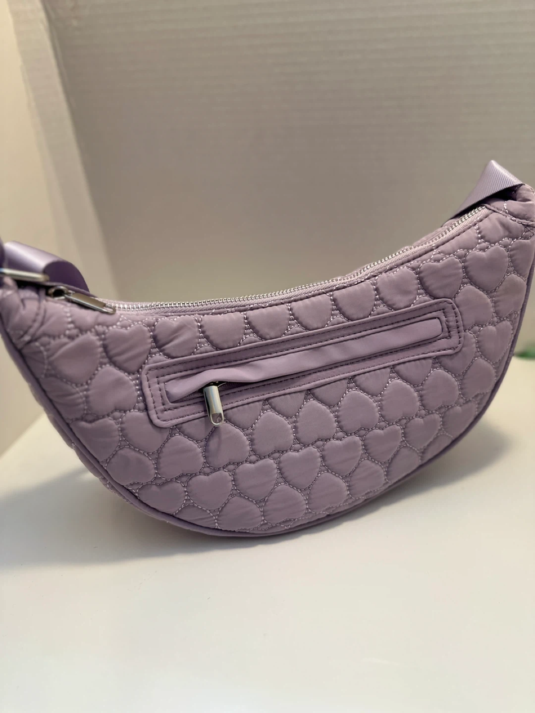 Here's a cute lavender crossbody bag featuring a quilted heart pattern! It's in great condition and ready for a new owner. It's a stylish and practical accessory for everyday use