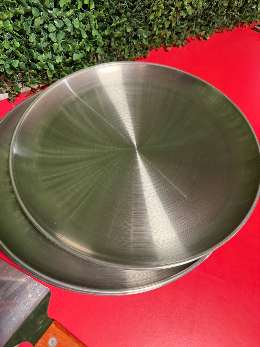 The pans are 30cm/12in in diameter and the servers are 26cm/10in long. They're made of food-grade stainless steel, so they're resistant to rust and have a smooth edge that won't scratch your hands. Plus, the pans have an anti-slip design with a flat bottom and a smooth, non-stick surface