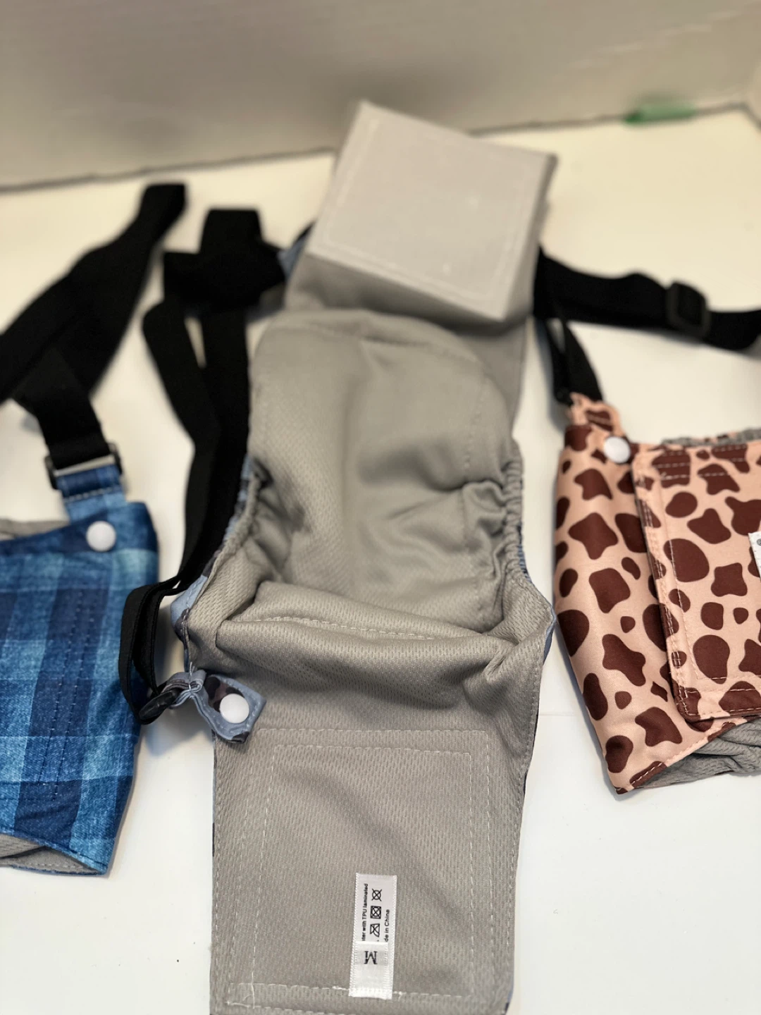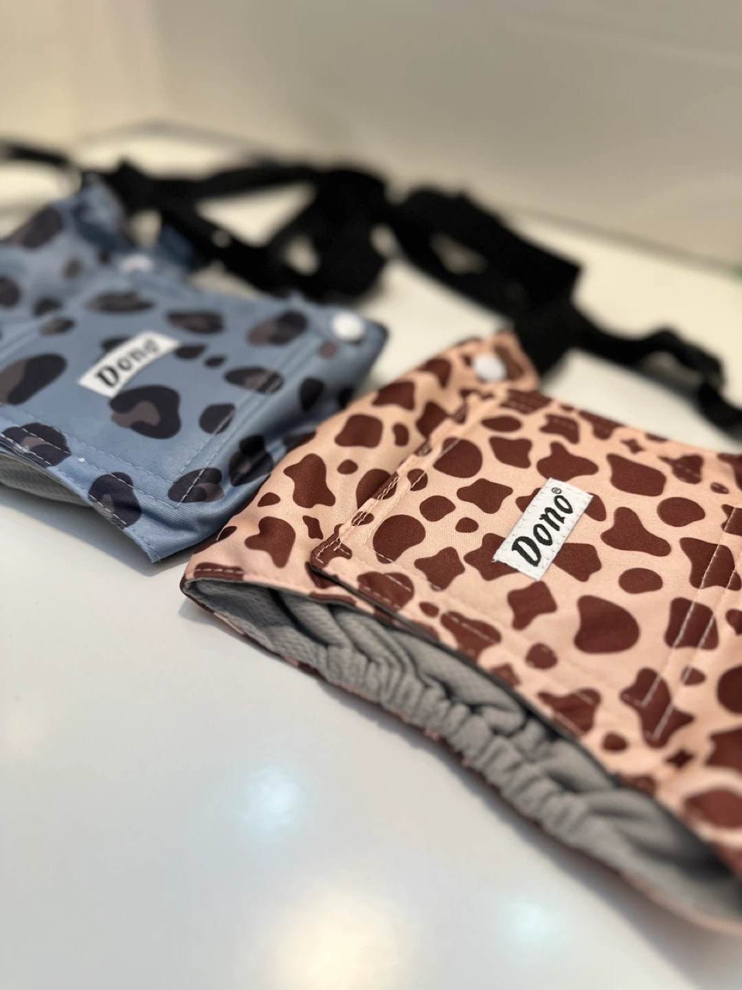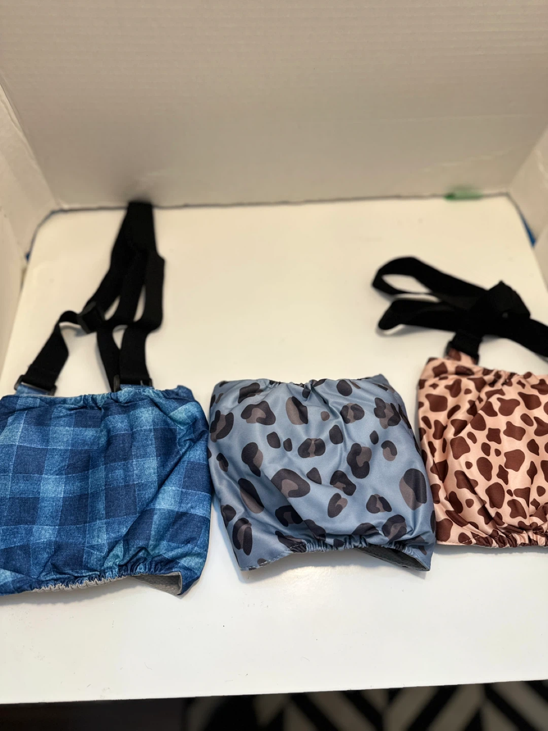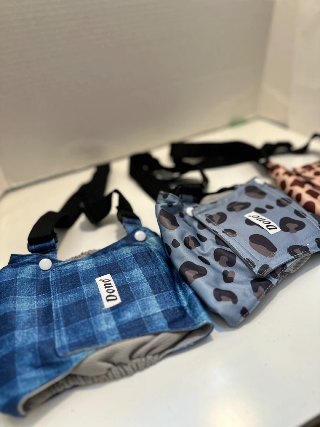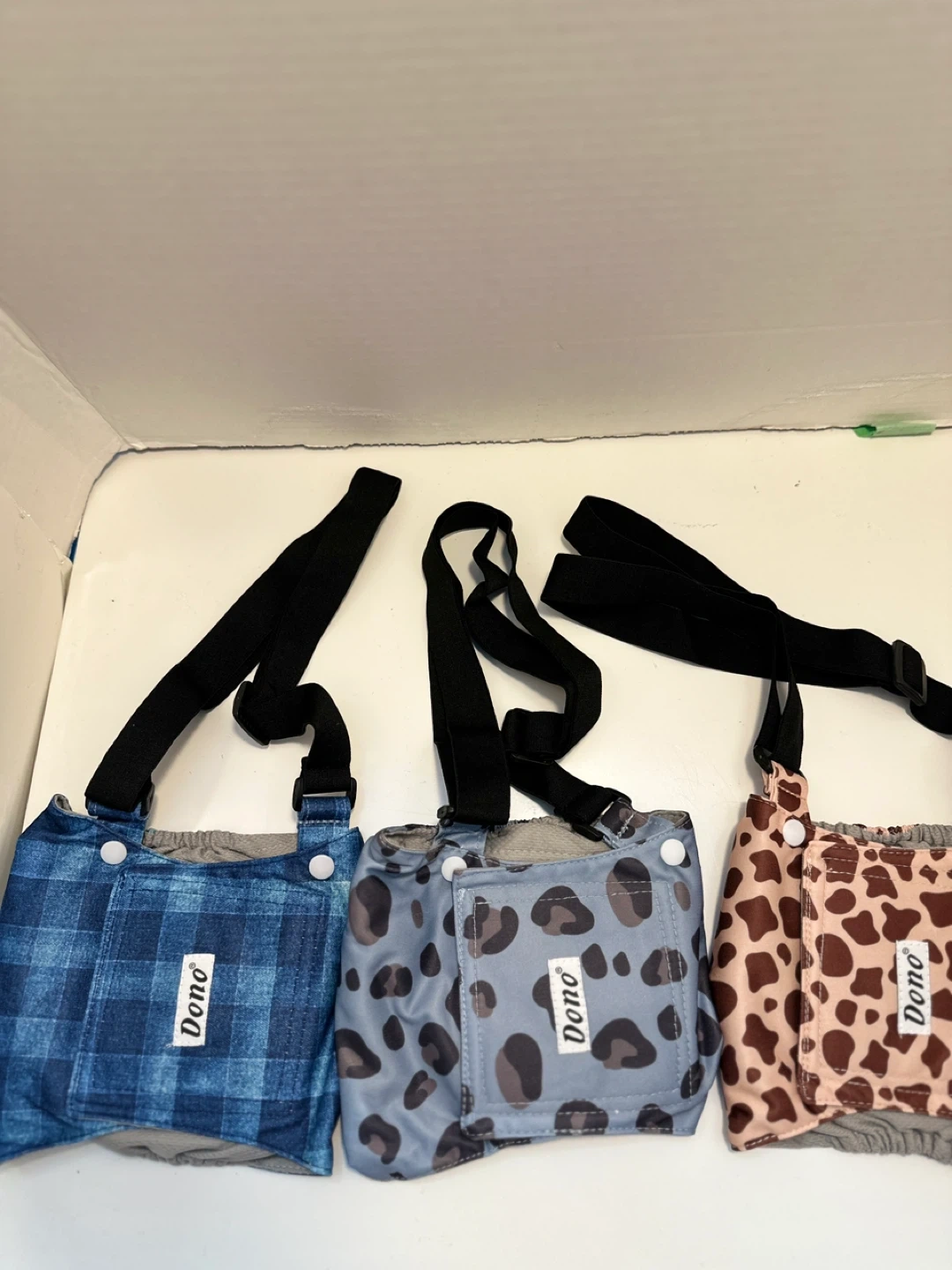 These Dono doggie diaper washable overalls are brand new and come in three fun patterns: blue plaid, leopard print, and cow print! They feature adjustable straps for a comfortable fit. Size M. Have 2 sets to sell