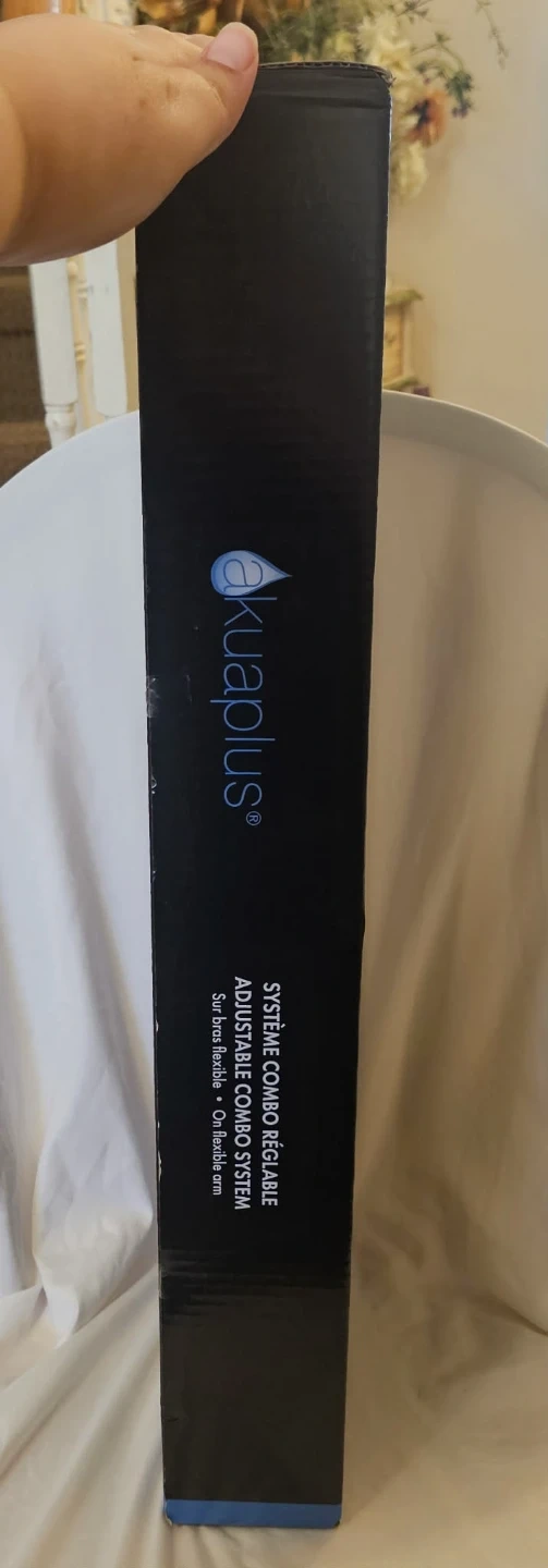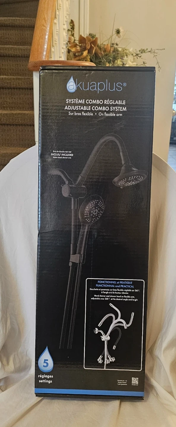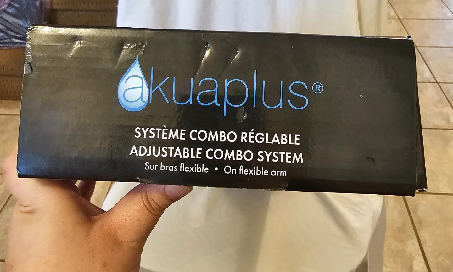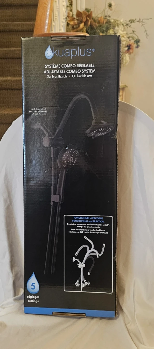 This Black Akuaplus Adjustable Combo System Shower Head is Brand New and never used. Sealed in Box.