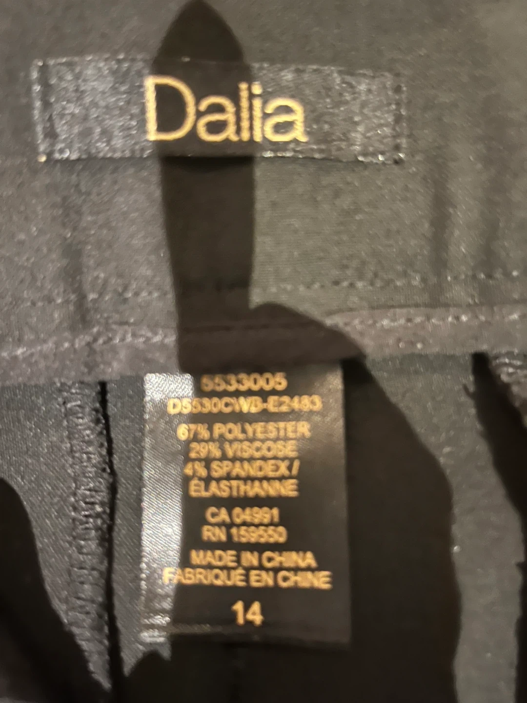 Selling a pair of Dalia dress pants in black. They're size 14 and made of 67% polyester, 29% viscose, and 4% spandex/elastane. They are brand new, never worn.
