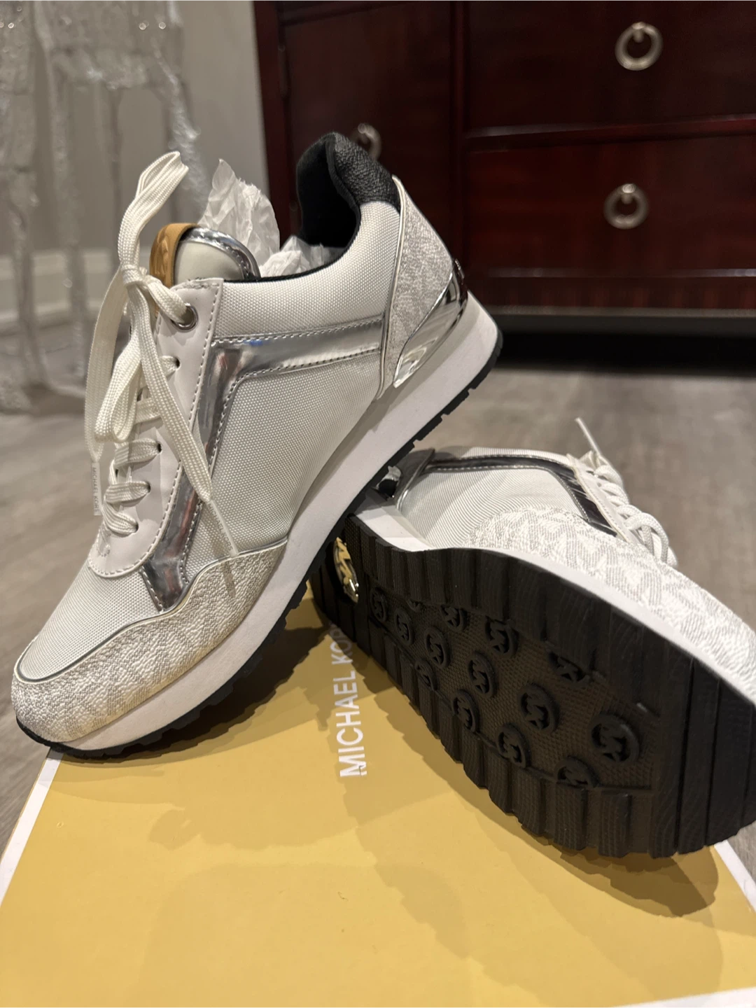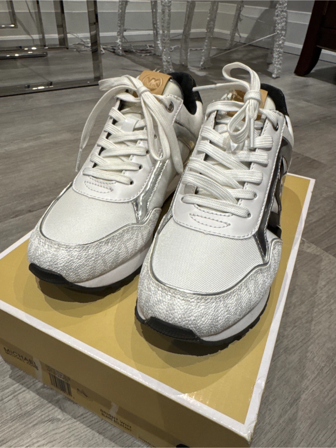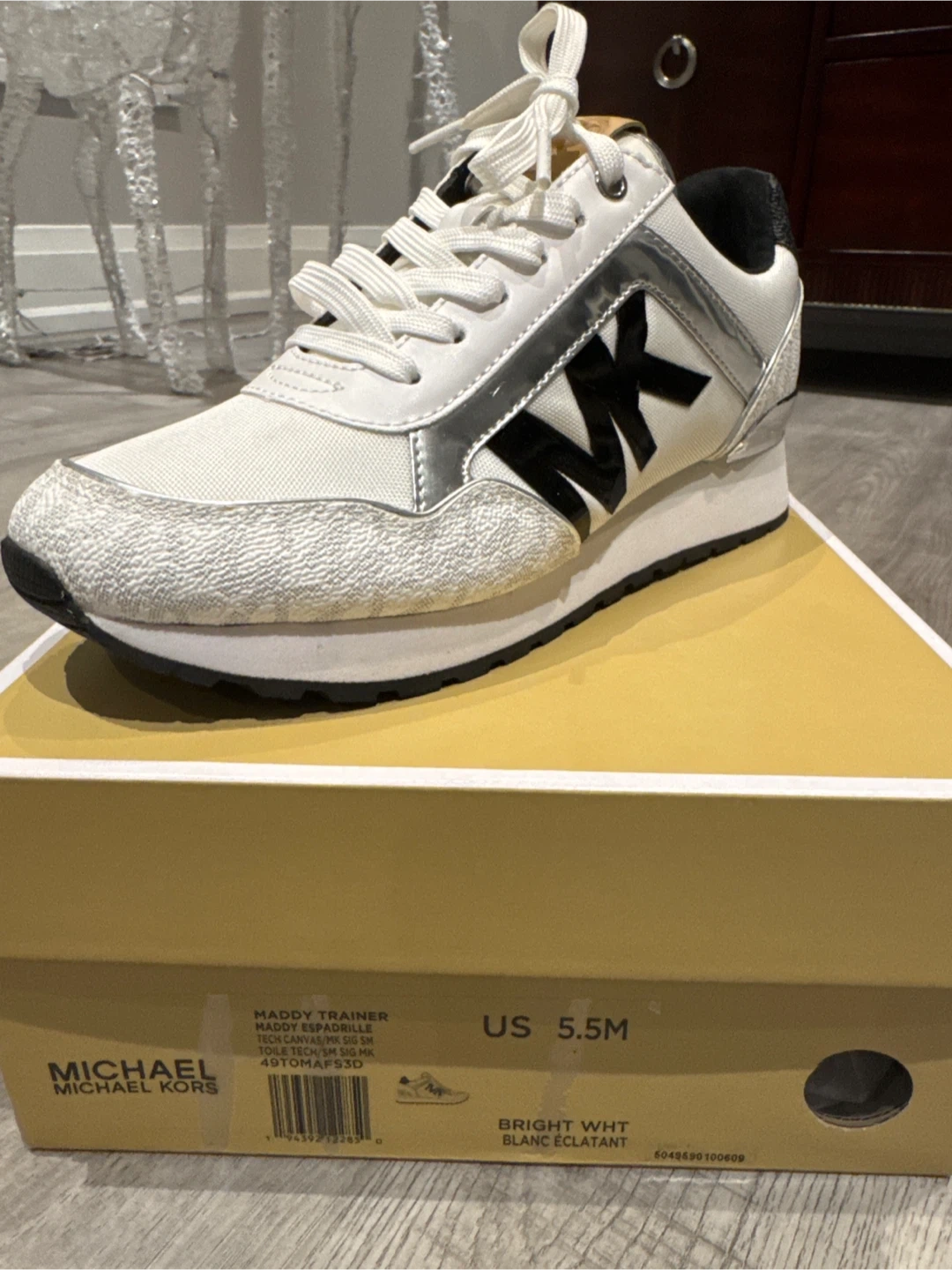 🔥🔥🔥Selling a new pair of Michael Kors Maddy trainers in size 5.5M. They are white with silver accents and the MK logo on the side. Comes with the original box!