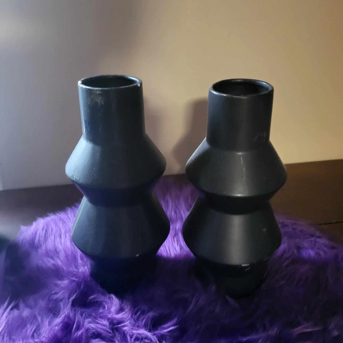 Selling a set of two black vases. They have a unique shape and would look great in any home. Smoke free home Rossland and Stevenson north