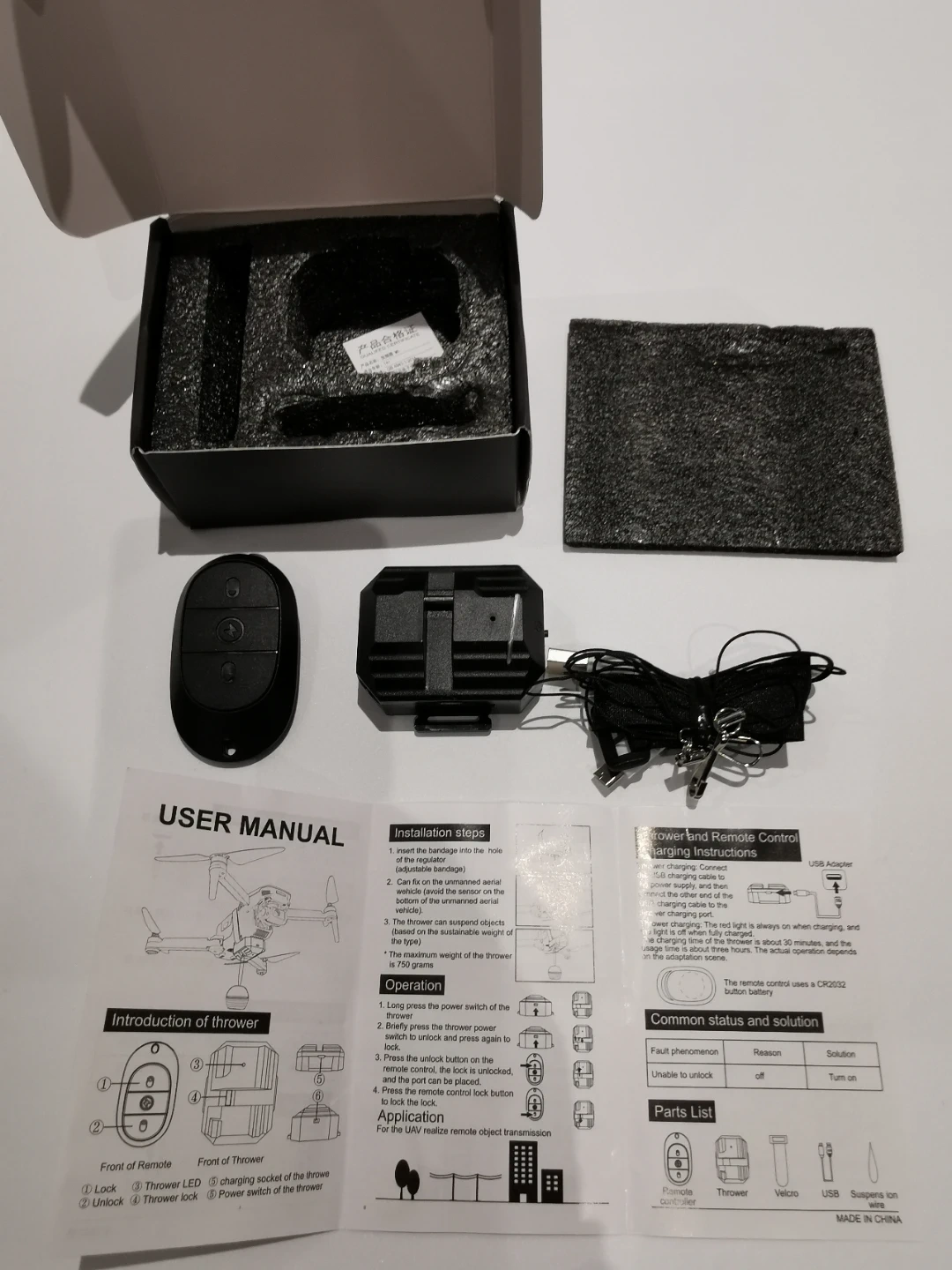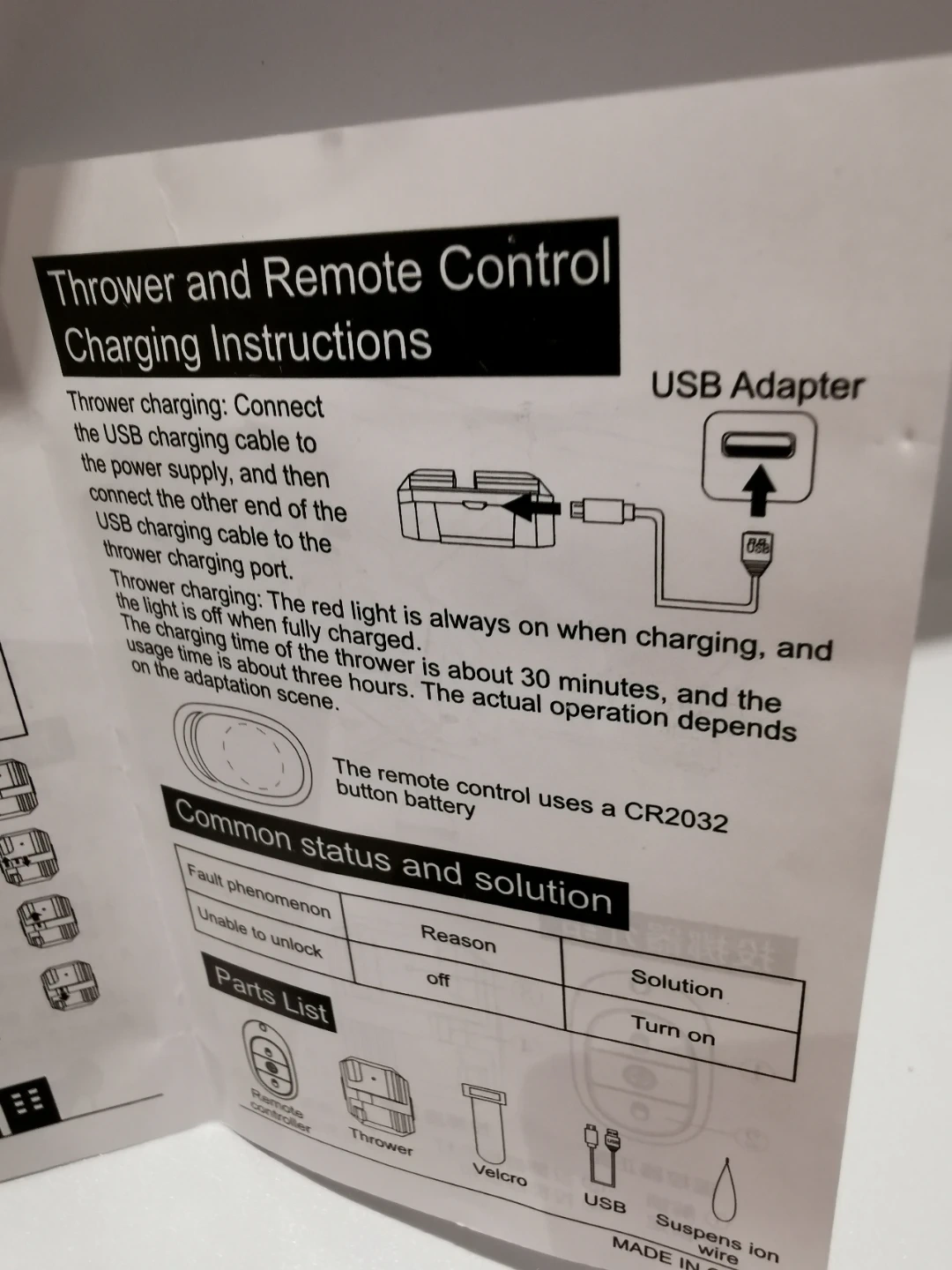 Included in the box are the thrower, remote controller, Velcro, USB adapter, and suspension wire