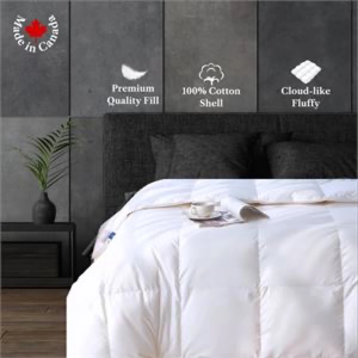 Snuggle up with this Royal Elite Feather Duvet! It features a premium quality fill with 95% US Standard small white goose feather and 5% white down cluster. The shell is made of 100% cotton, offering a cloud-like fluffy feel. It's made in Canada with gift packaging