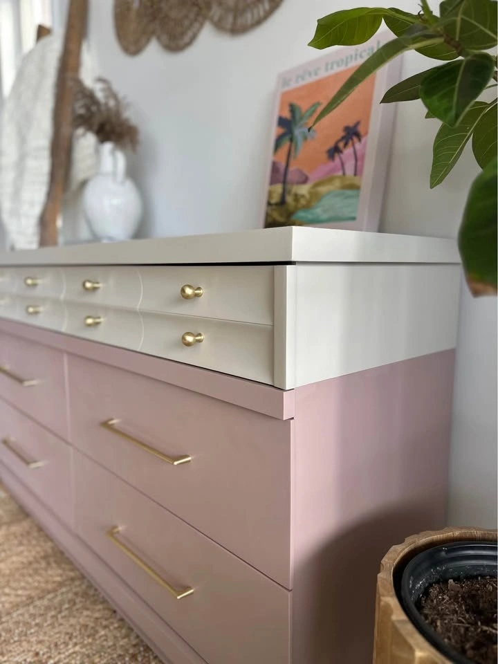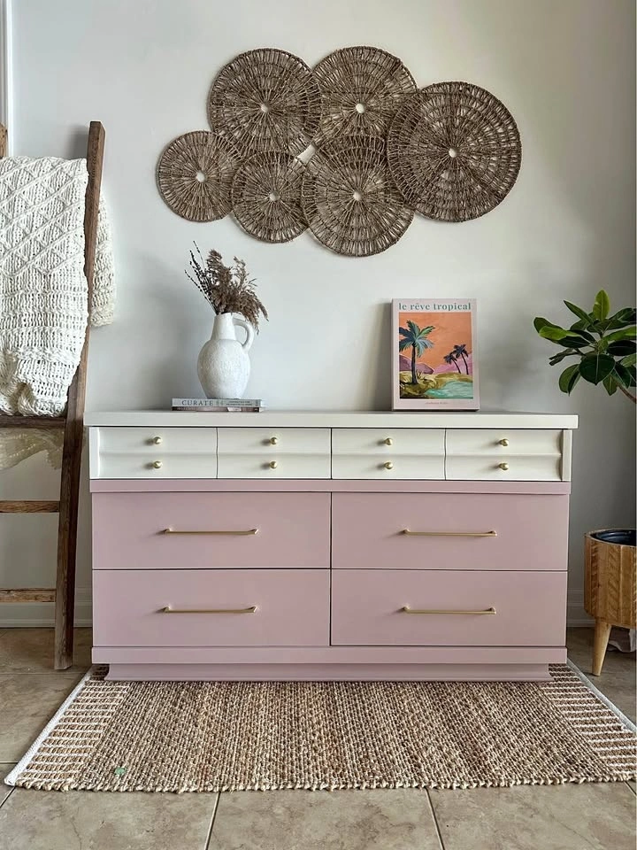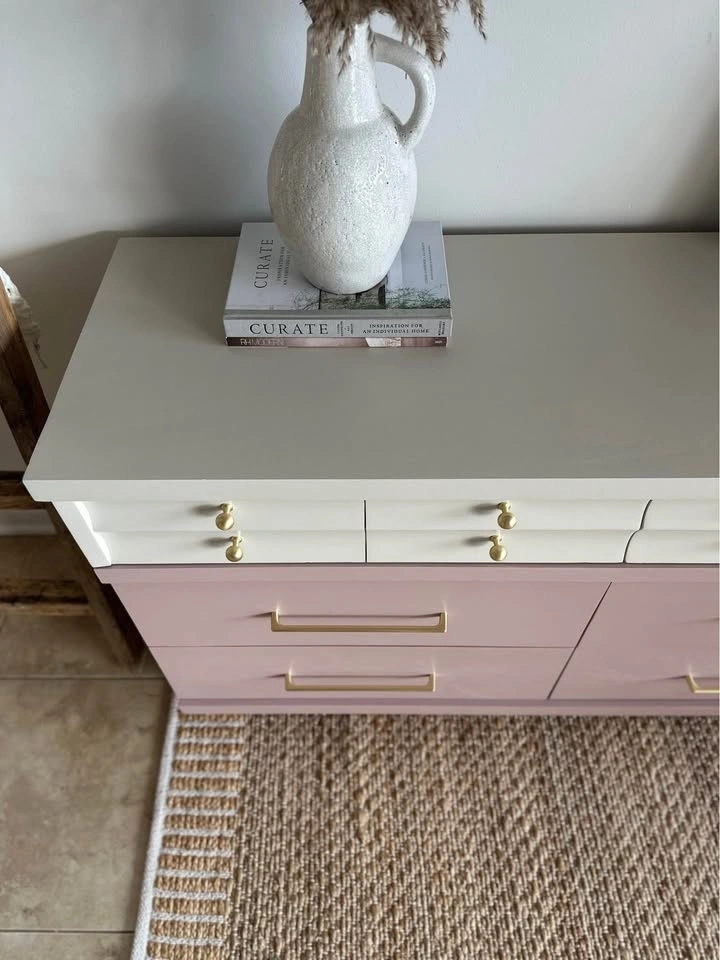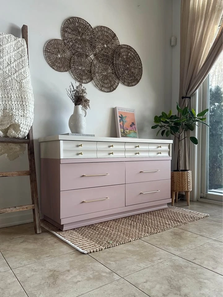 Kroehler Dipped Dresser – professionally painted. The top is painted in Revere Pewter (Benjamin Moore) and the bottom features a custom blended dusty mauve—a muted mix of pink and lavender. Finished with brushed gold knobs and stunning oversized 10” pulls.