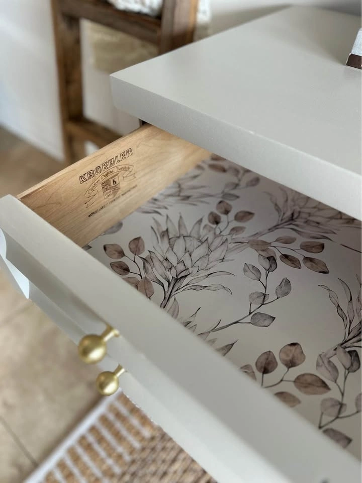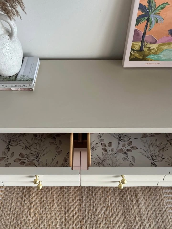 The top two drawers are lined with a floral paper that complements the paint color.