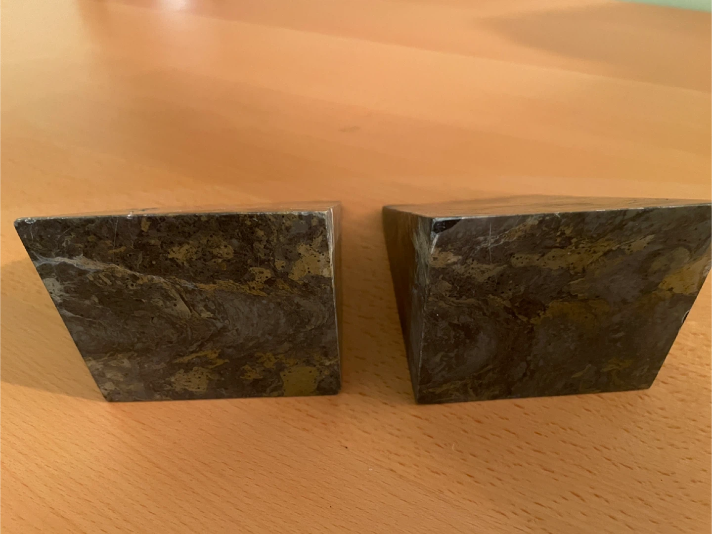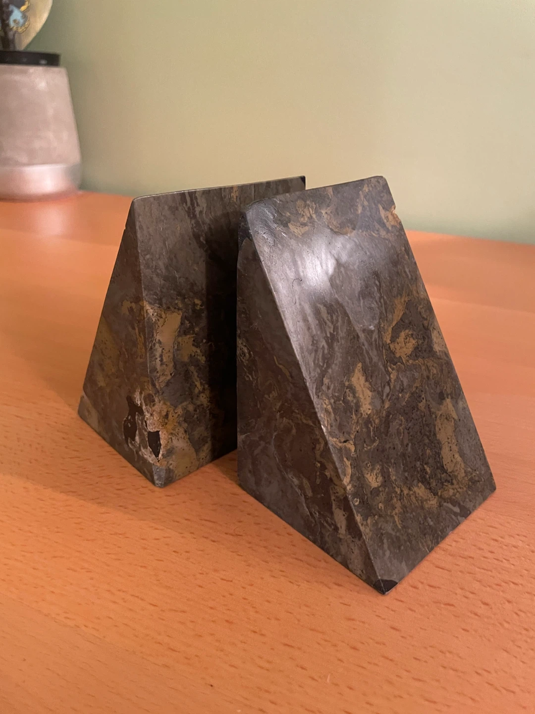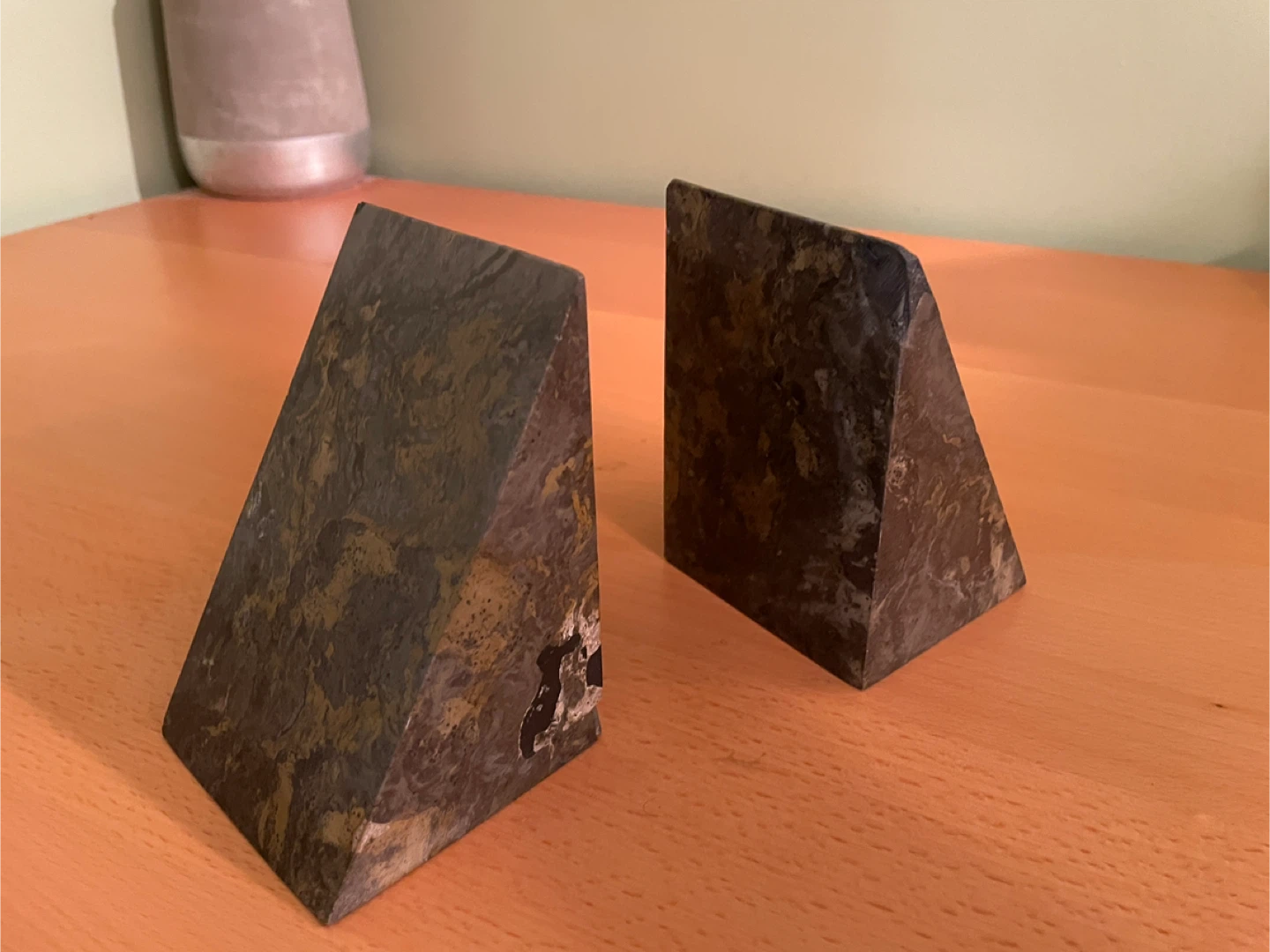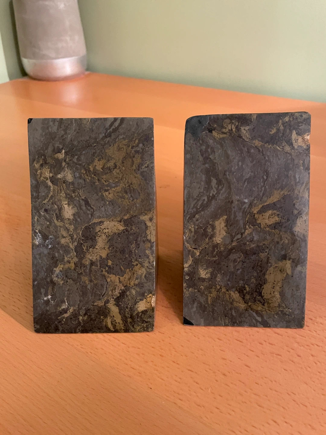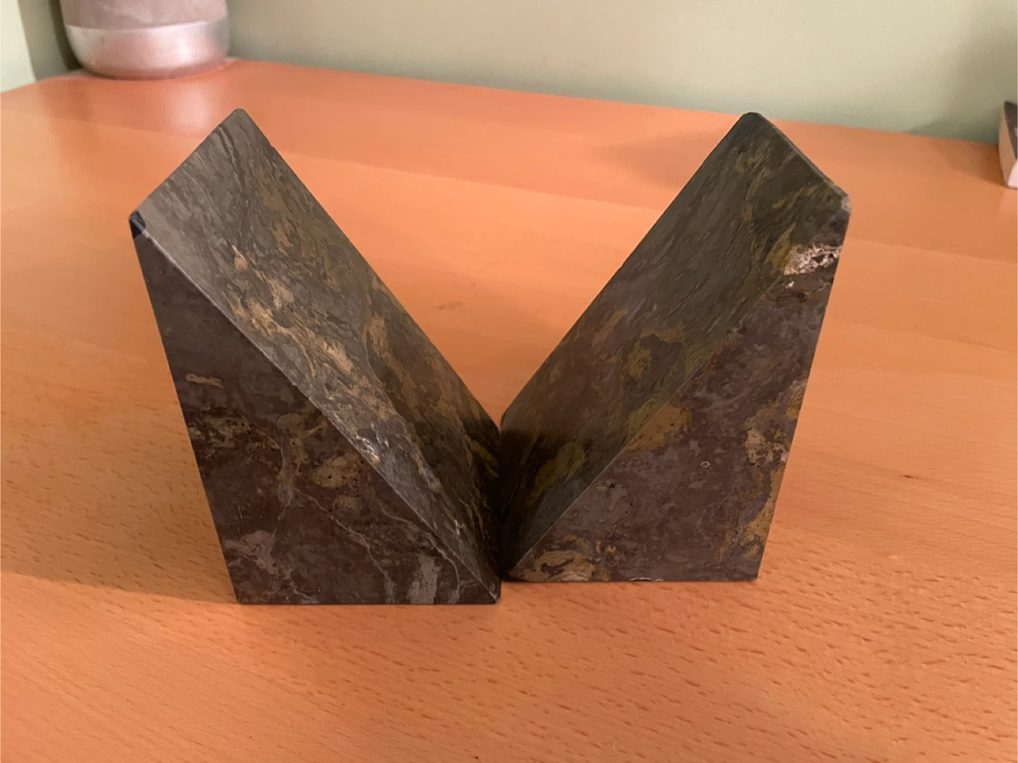 Here's a set of two marble bookends. They have a lovely natural stone pattern and are perfect for keeping your books organized on a shelf or desk! 5” tall