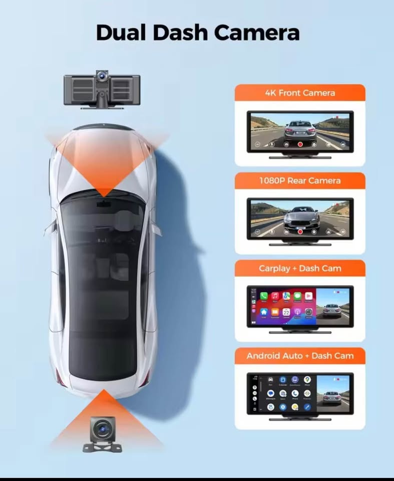 ✅ Dual Cameras: Built-in 4K Front Dash Cam + 1080p Rear/Reverse Camera.
