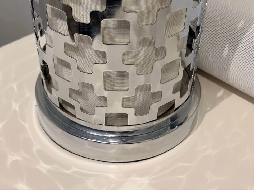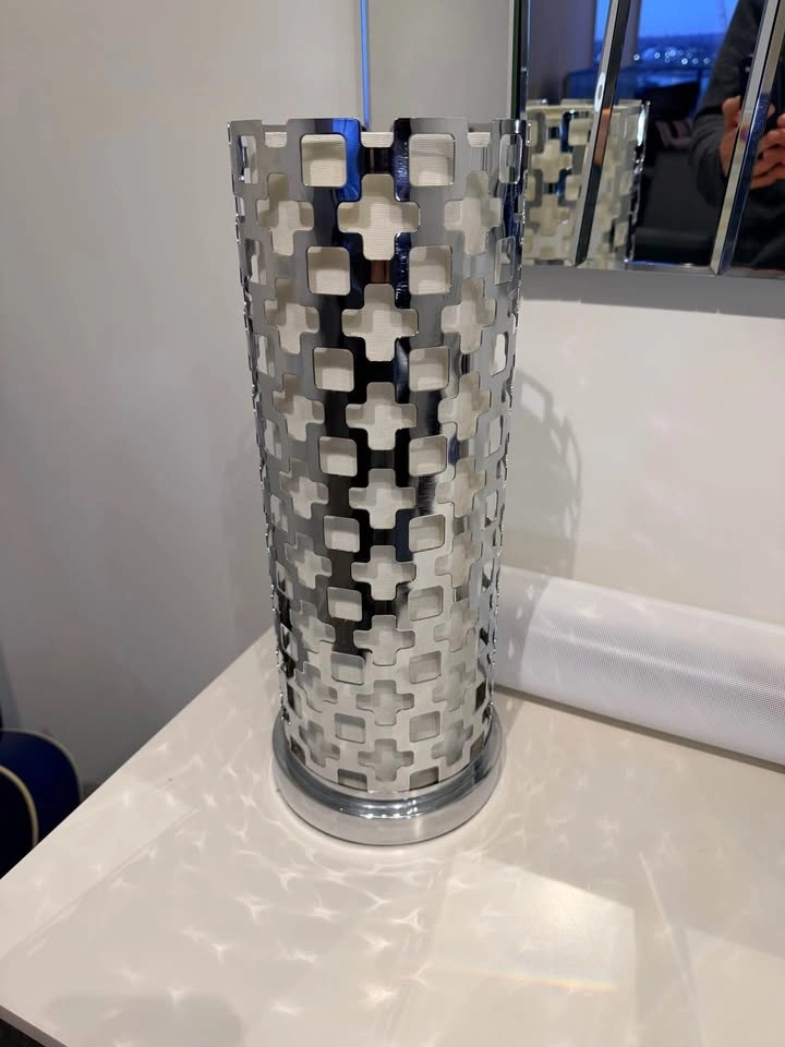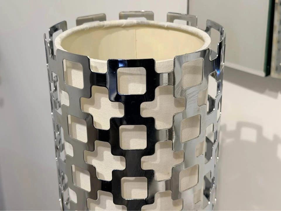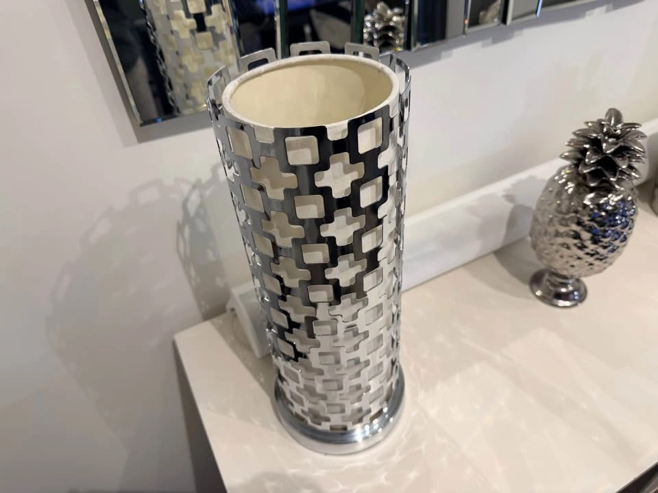 Modern decorative accent lamp with a polished chrome finish and geometric cut-out pattern. Cylindrical design creates a soft ambient glow when illuminated. Ideal as a statement piece on a console table, sideboard, or shelf. This is best used as beautiful ambient or accent lighting. Dimensions: • Height: 16 inches • Diameter: 6.5 inches Details: • Chrome / metallic finish • Cylindrical perforated design • Weighted base for stability • Fully working, my lightbulb will be included • Very good condition like new Pickup: North Vancouver @ Seylynn Village (near ironworkers bridge)