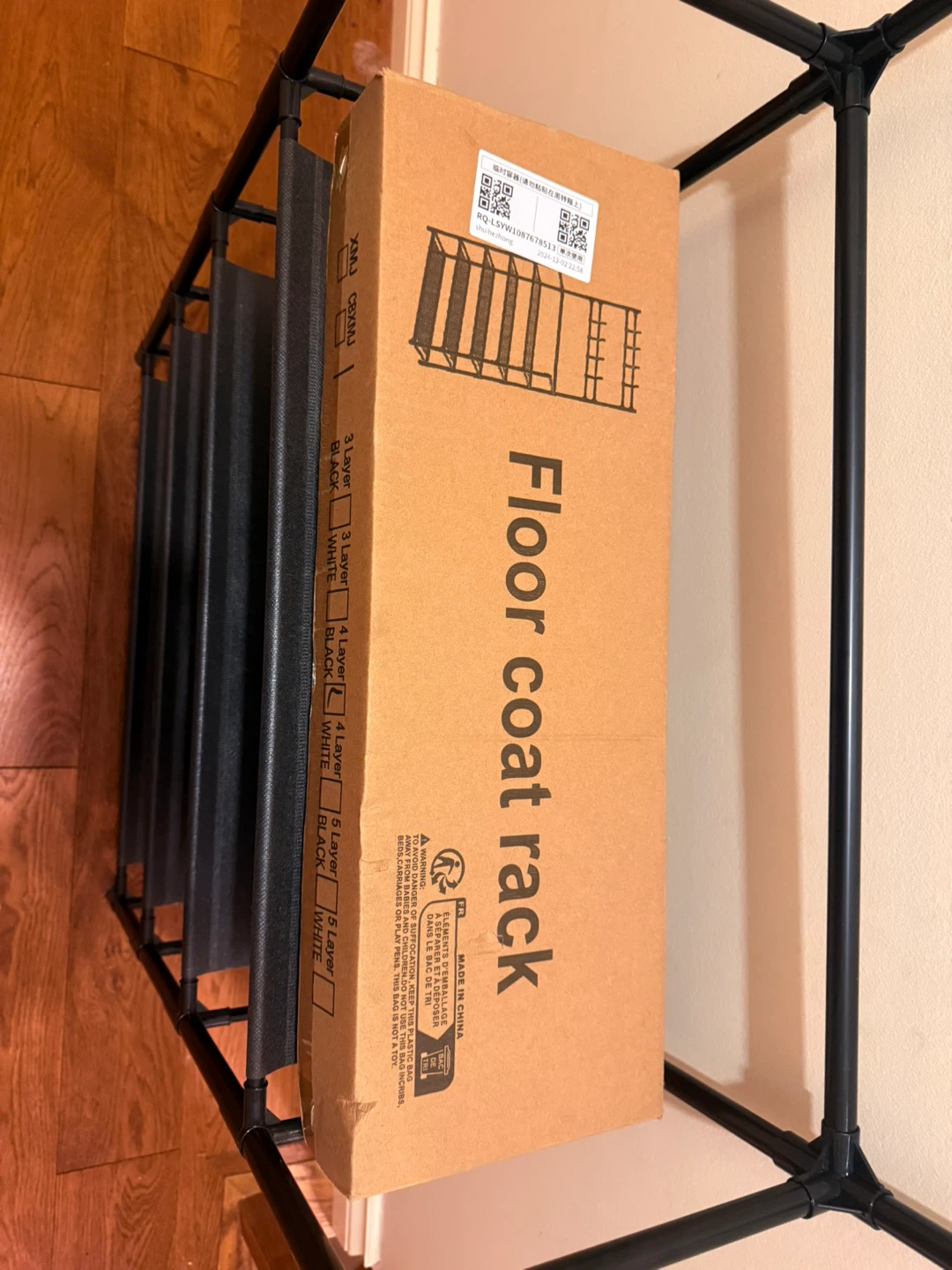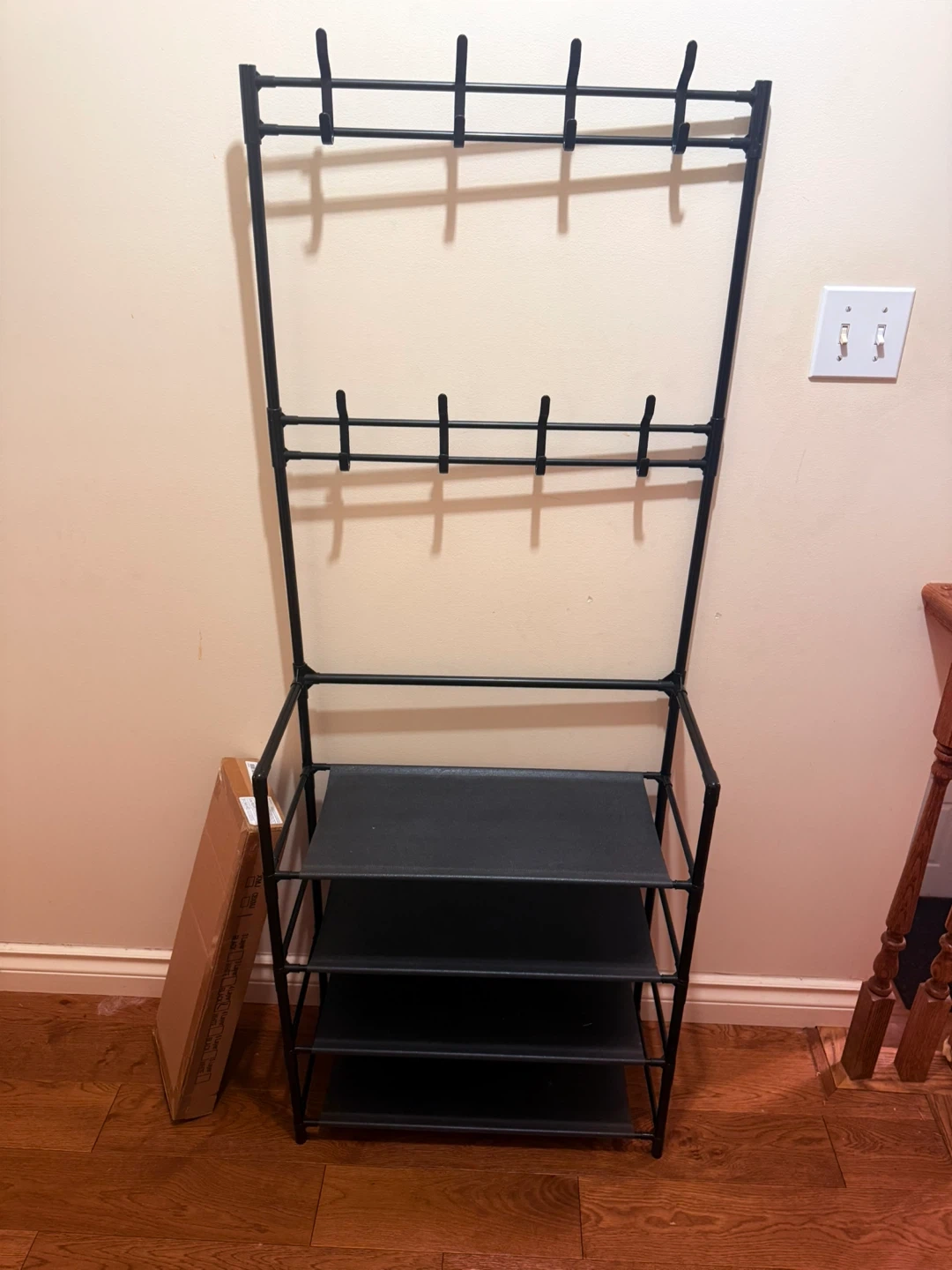 Selling a kid/pet size floor coat rack in black, complete with shoe or outdoor gear storage shelves. Brand New! Perfect for keeping your entryway organized with space to hang light wet items to dry.