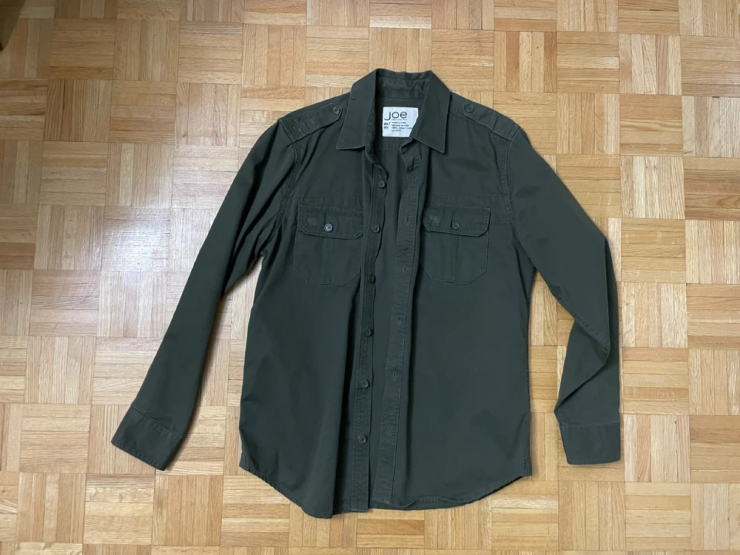 Here's a Joe Fresh olive green shirt! It's in great condition and ready for a new owner. Perfect for casual wear or layering
