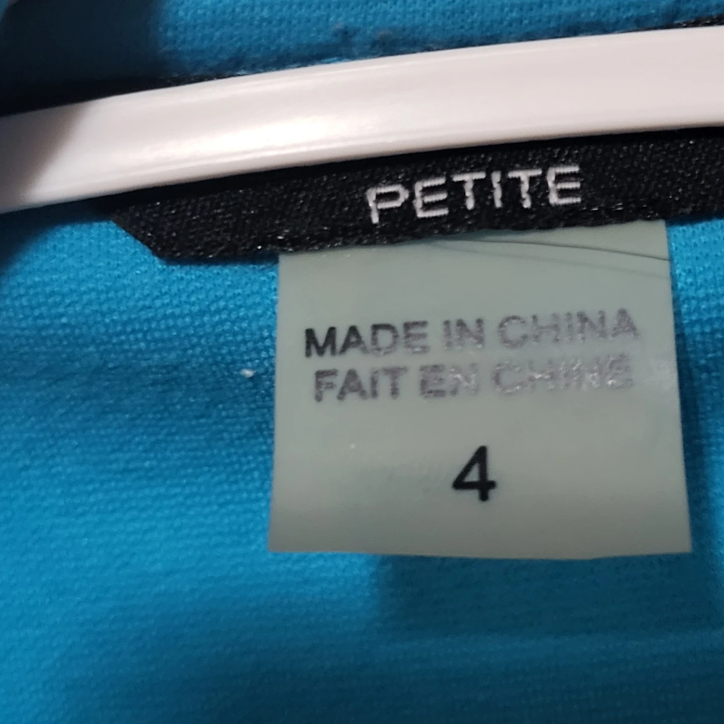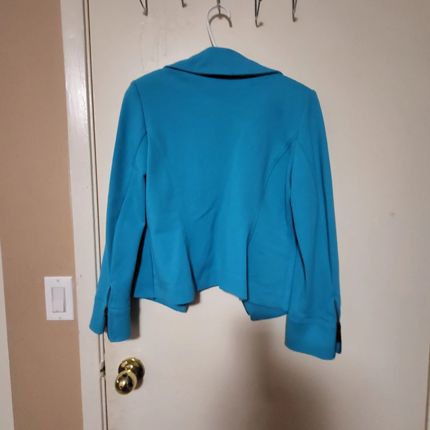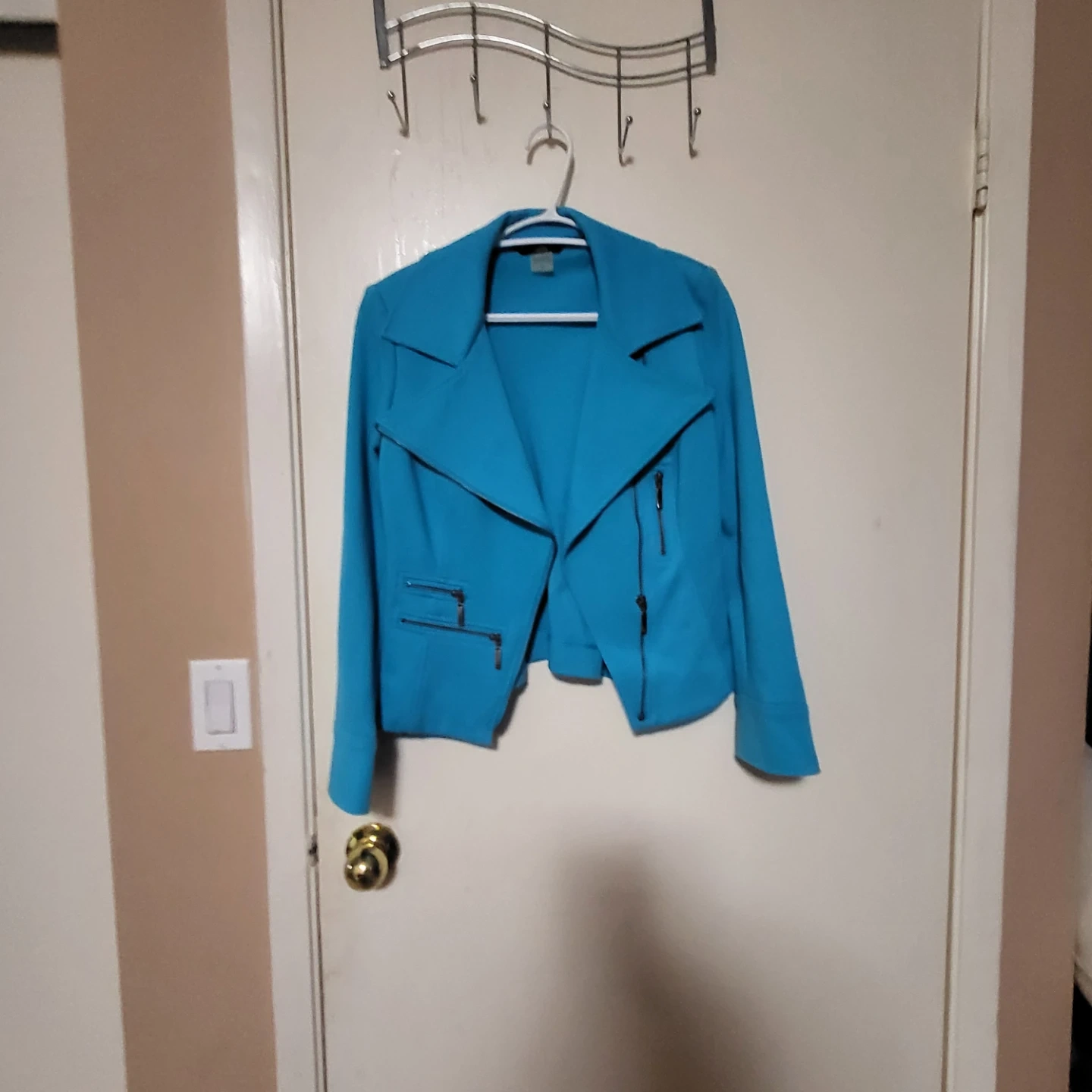 A stylish turquoise moto jacket in a petite size 4! This jacket is perfect for adding a pop of colour to your wardrobe. It's in great condition and ready for a new owner