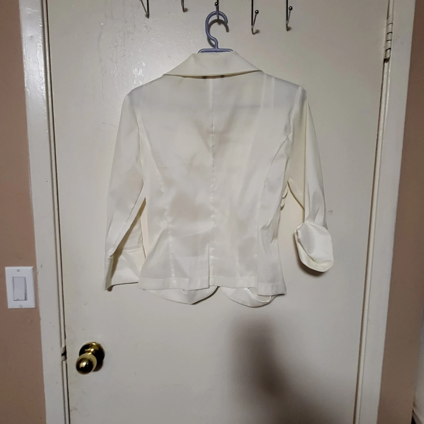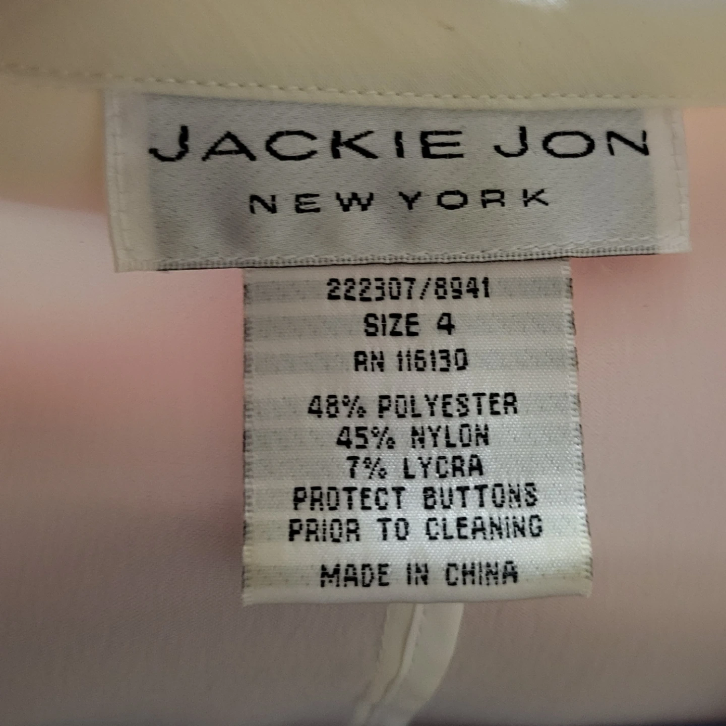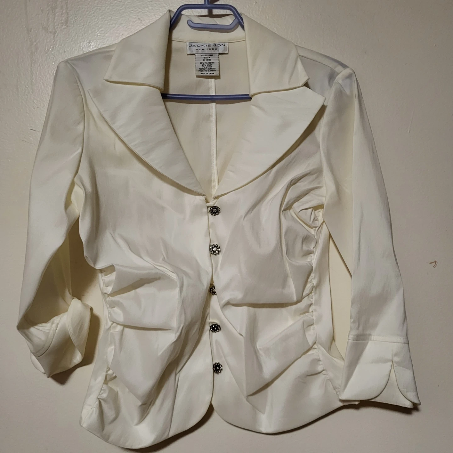 Here's a Jackie Jon New York blazer in size 4! It's made of 48% polyester, 45% nylon, and 7% lycra. A stylish addition to any wardrobe!