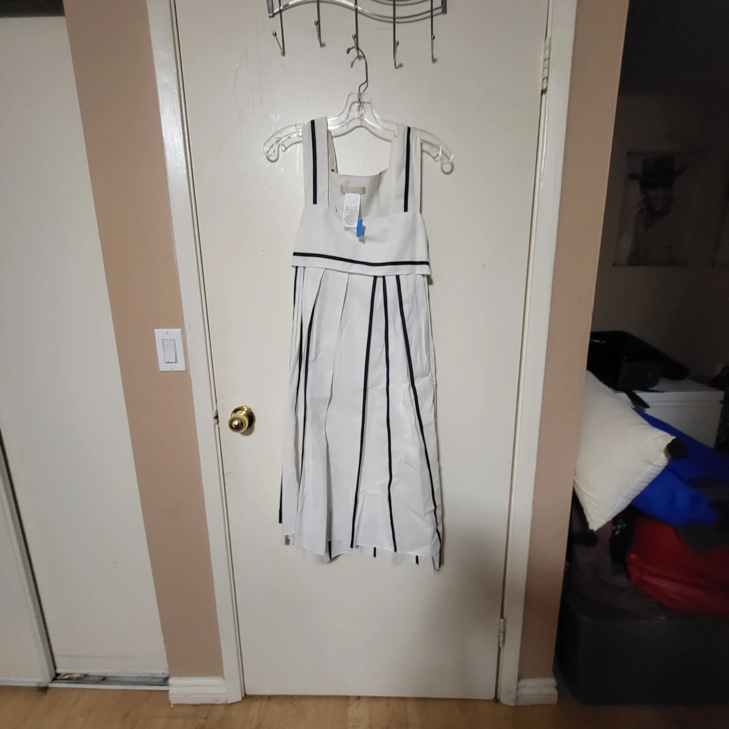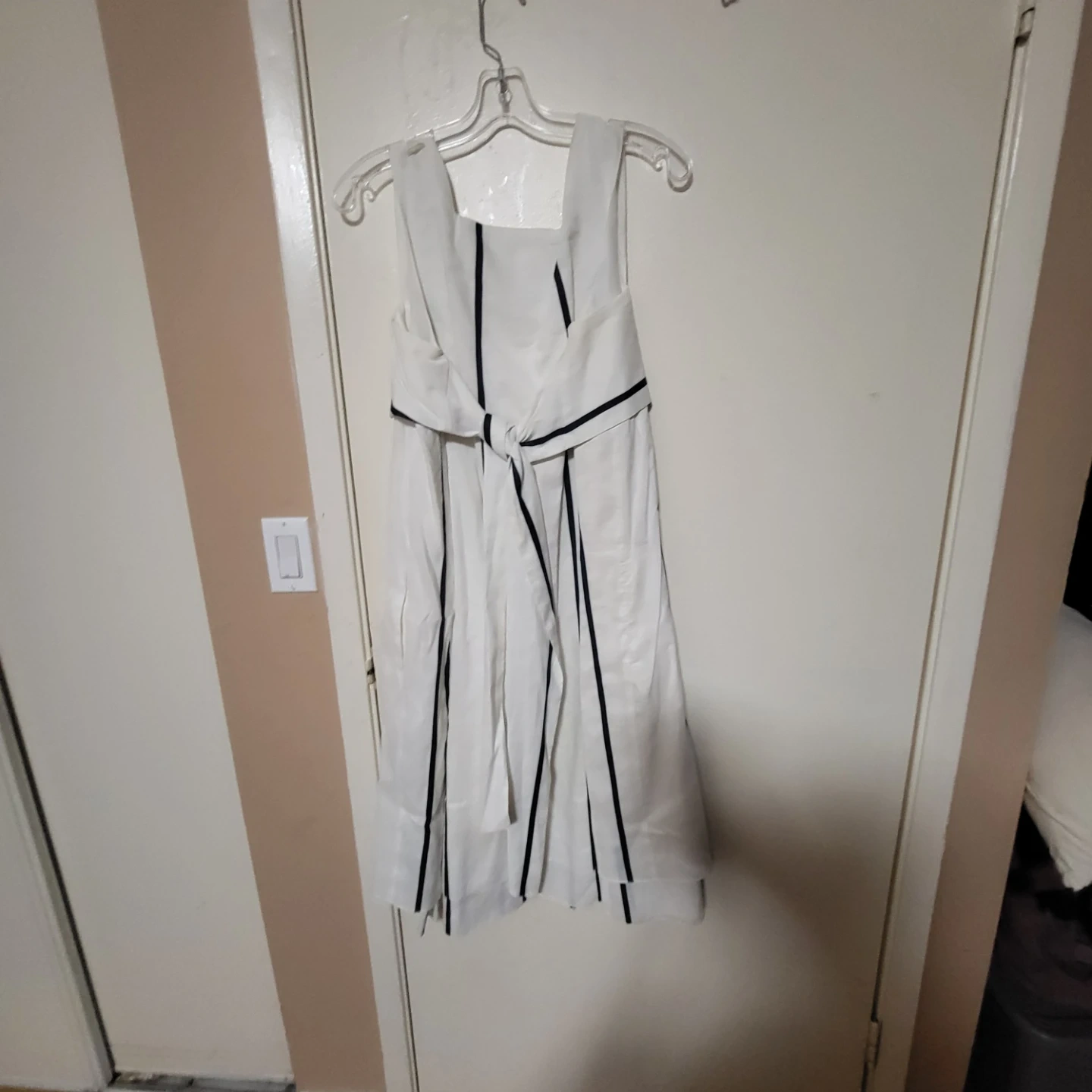 Selling a cute Zara dress in white with black stripes. It's a size M and in good condition. The material is a blend of ramie and cotton, making it lightweight and comfy for summer days!