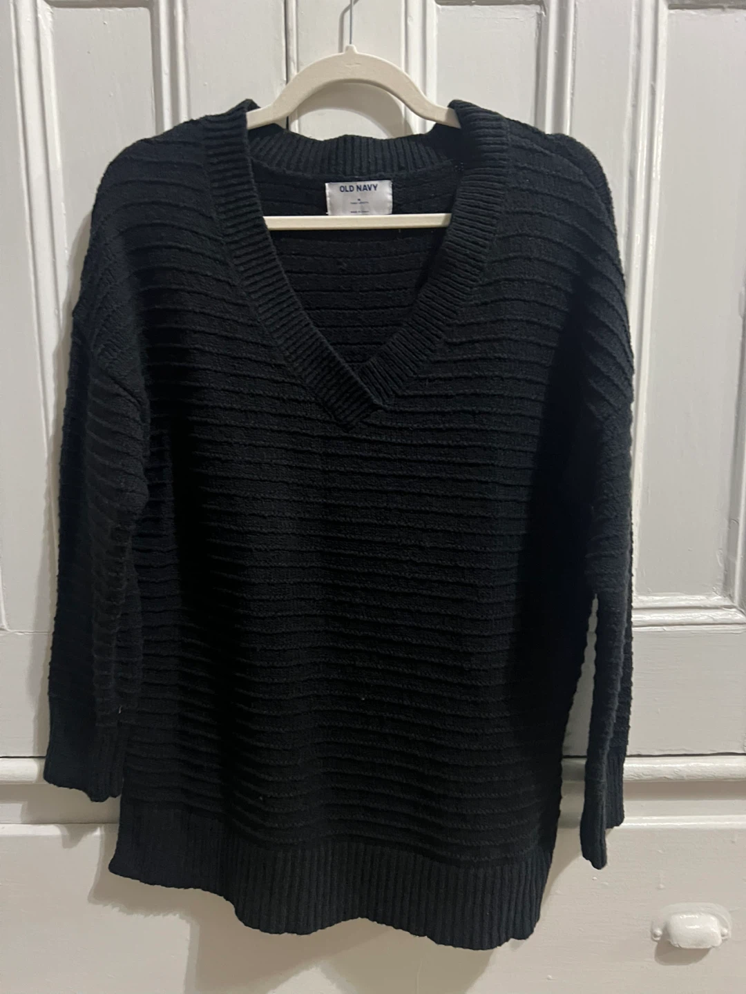 Selling a cozy 100% cotton black V-neck sweater from Old Navy! It's in great condition and perfect for layering or wearing on its own. The sweater has a ribbed texture and a comfortable fit. It's a stylish and versatile addition to any wardrobe!