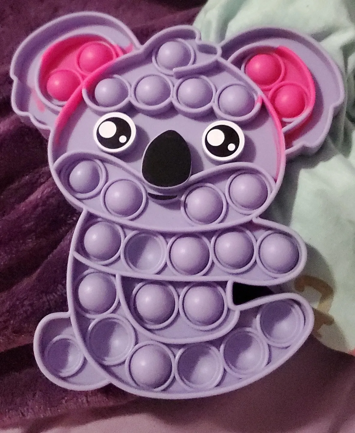 This is a cute koala-shaped Pop It fidget toy! It's purple with pink accents and is in great condition. Perfect for stress relief or just some fun fidgeting