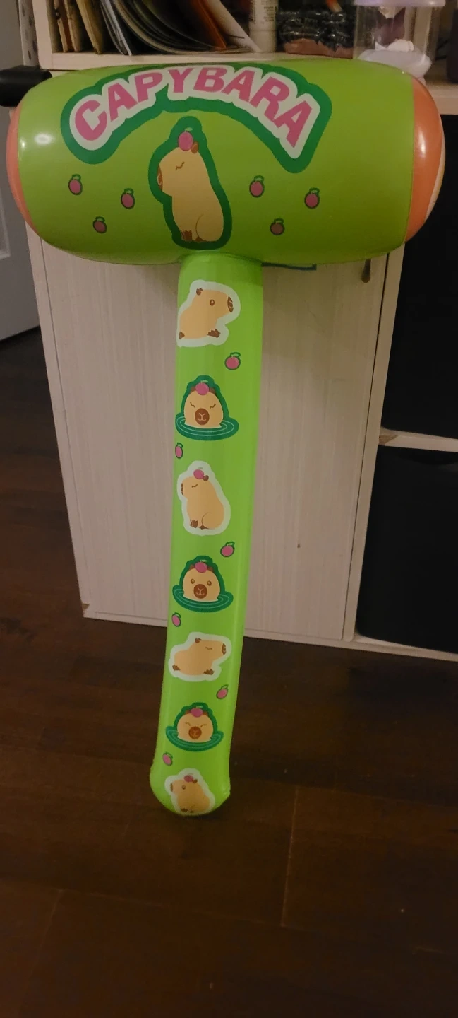 Capybara inflatable hammer! It's green with cute capybara designs all over it. Perfect for some lighthearted fun, party ideas, costume prop or just bonking someone ๐