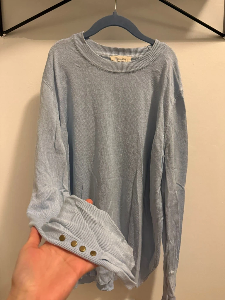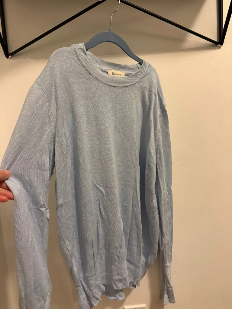 Here's a light blue knit sweater. It's a comfy and stylish piece for layering or wearing on its own. The knit texture adds a nice touch, and the light blue colour is super versatile. It's in great condition and ready for a new home!