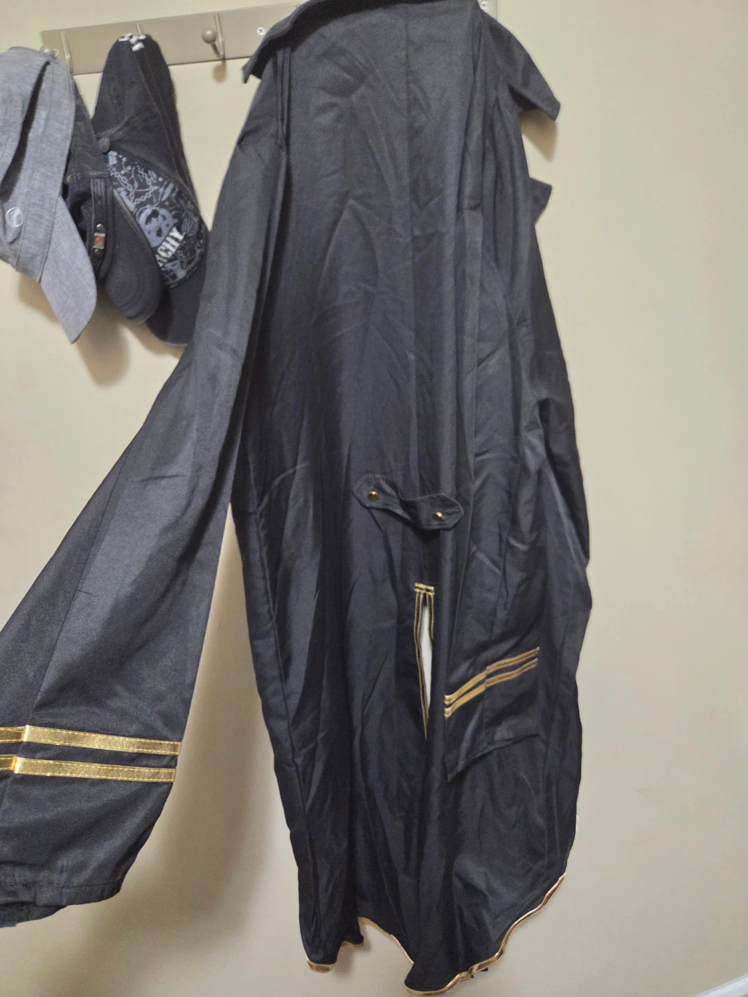 Here's a black robe with gold trim! It has a unique design and could be great for costumes or just lounging around the house. It's in great condition.