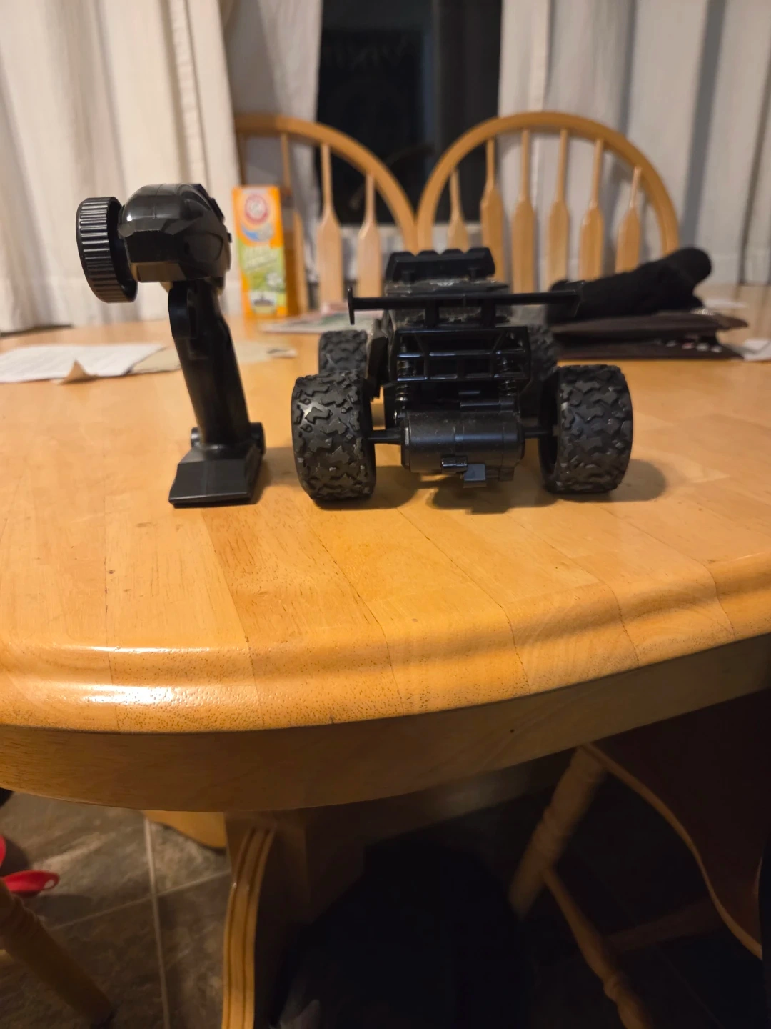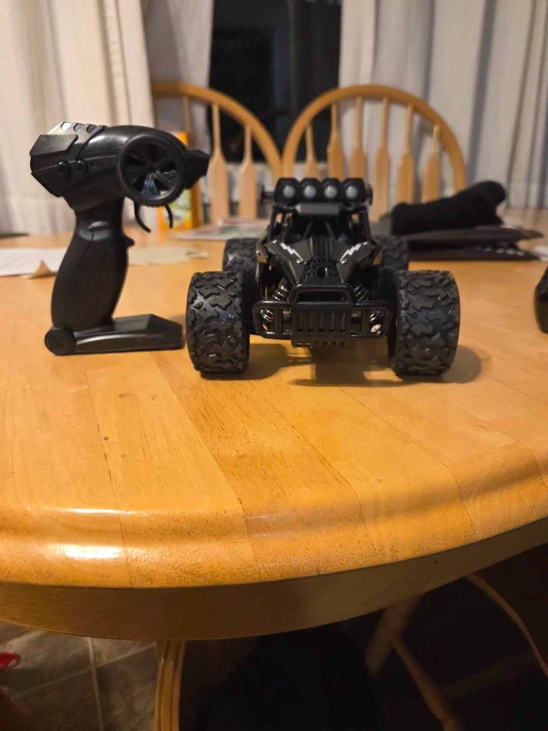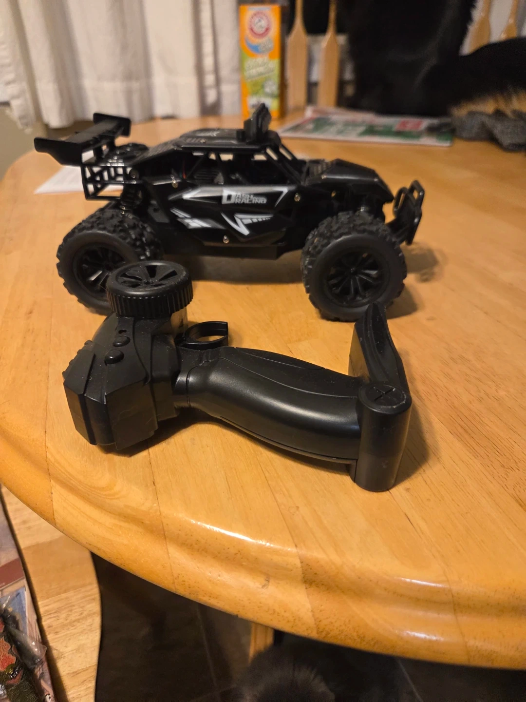 Selling a black RC car that's ready for some off-road action! It comes with a remote control, so you can start driving right away. It looks like it's in great condition and ready for a new adventure