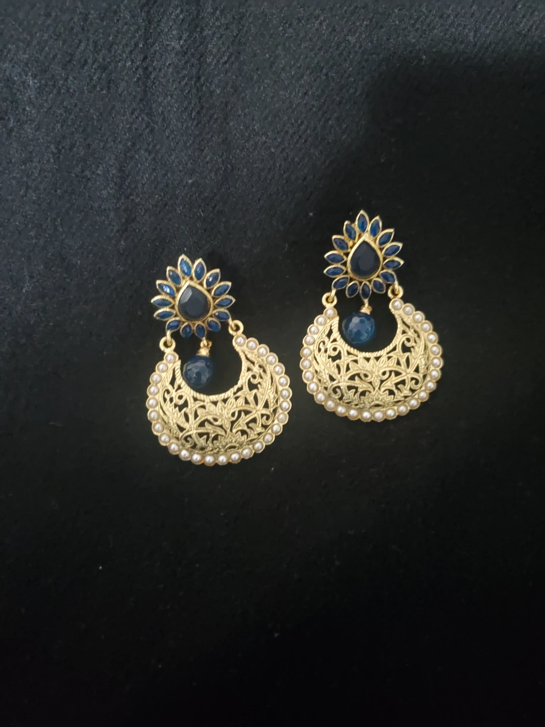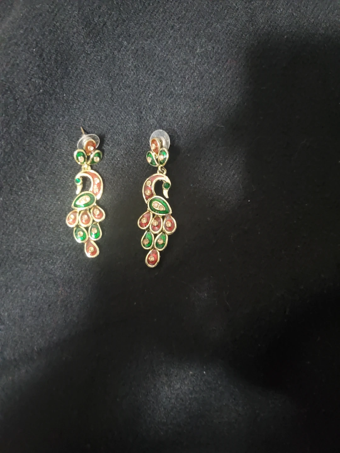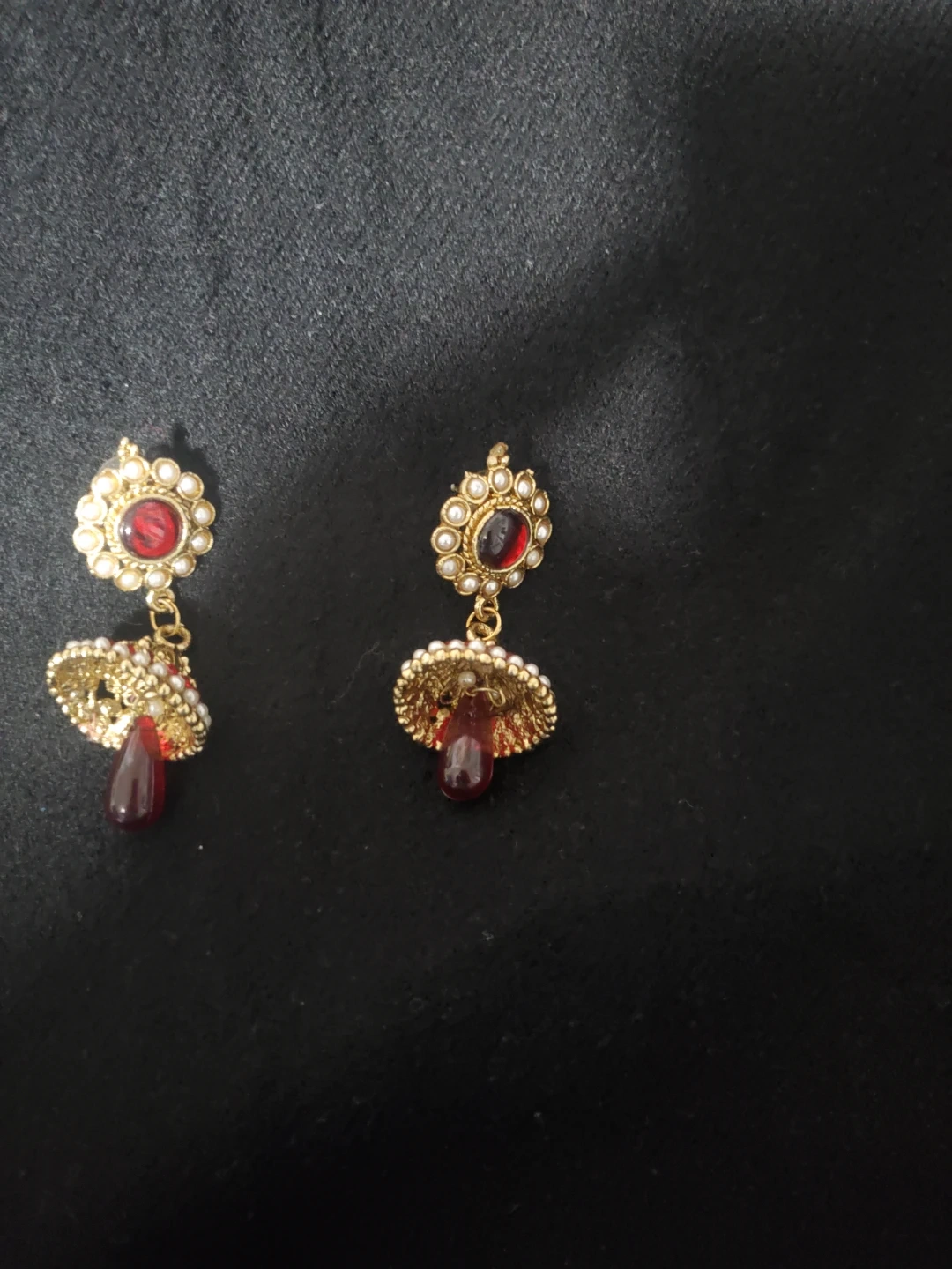 Free. Selling a set of earrings in a gold tone with assorted styles. These are perfect for adding a touch of elegance to any outfit! They feature various designs with blue, red, and pearl accents.