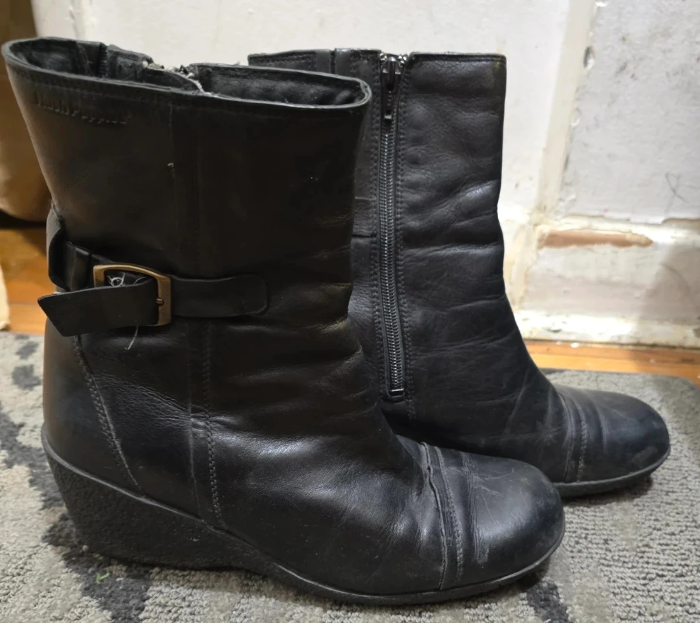 Selling a pair of Hush Puppies black leather wedge boots. They show some signs of wear, but still have lots of life left in them! Perfect for adding a bit of height and style to your outfits.