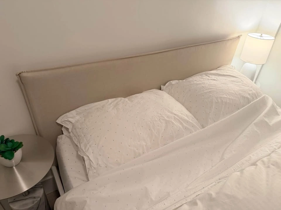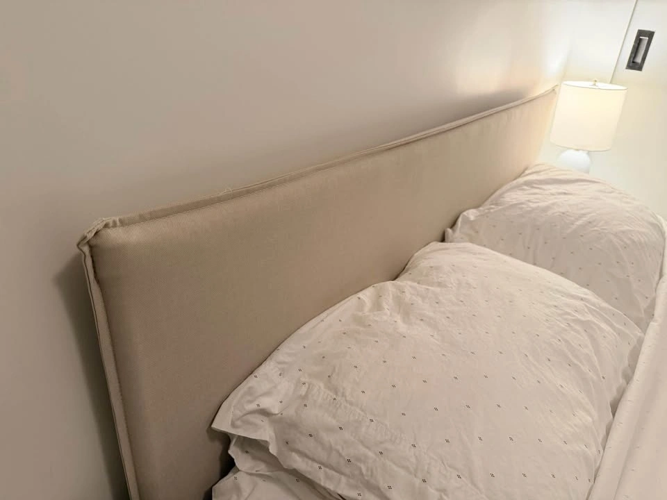 • IKEA KLEPPSTAD double bed, white frame with light beige fabric headboard (used once, bought at $200+tax)