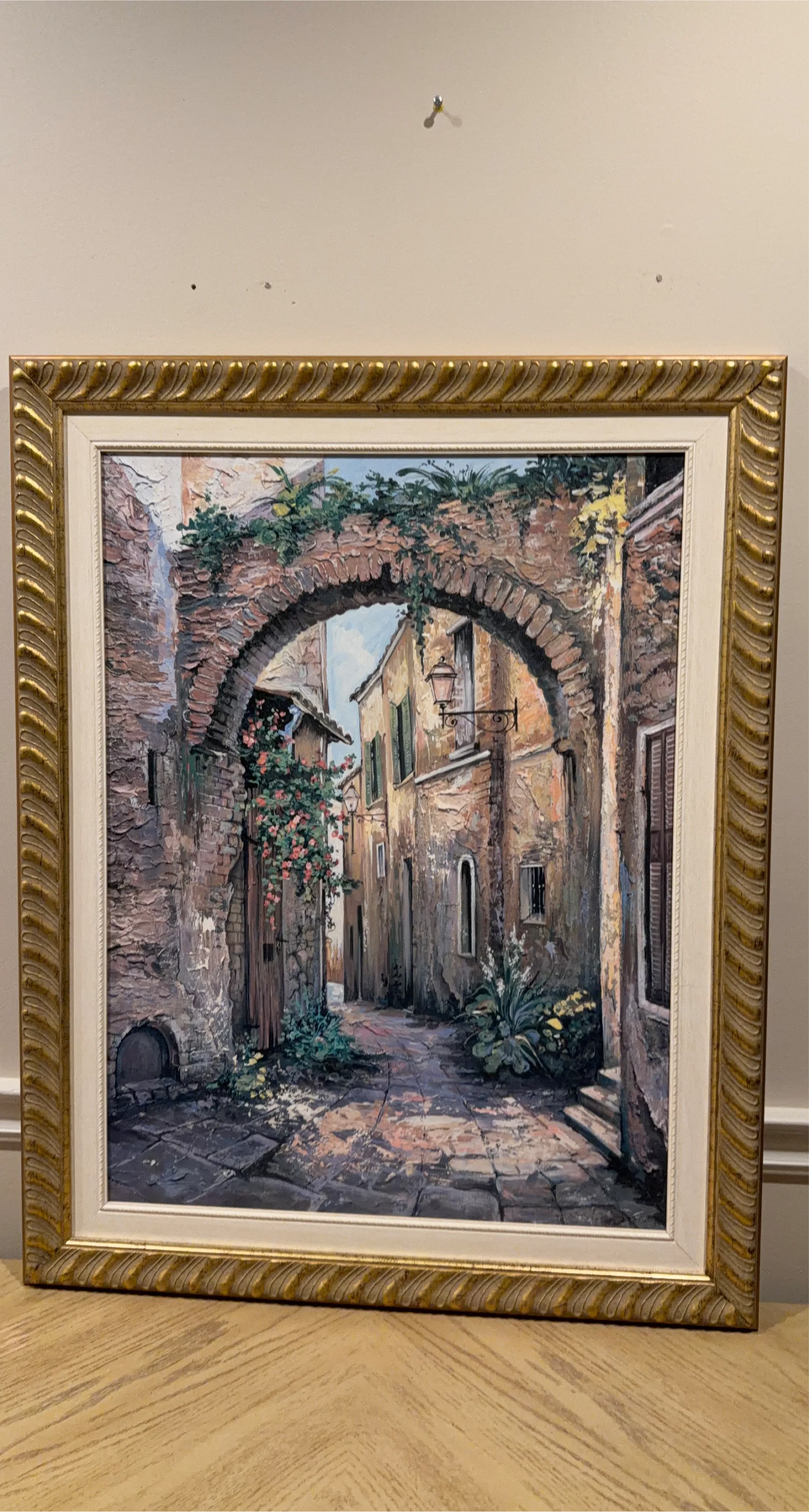 This is a beautiful framed printed from oil painting depicting a charming Italian street scene. The painting features an archway covered in greenery and flowers, with buildings lining a narrow cobblestone street. The frame is gold-coloured and ornate, adding to the painting's classic appeal. It would make a lovely addition to any home!