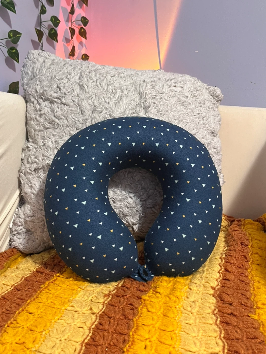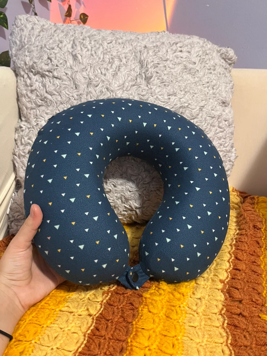I'm selling a comfy travel neck pillow! It's in great shape and ready for your next adventure. The pillow is a navy blue colour with a cute triangle pattern