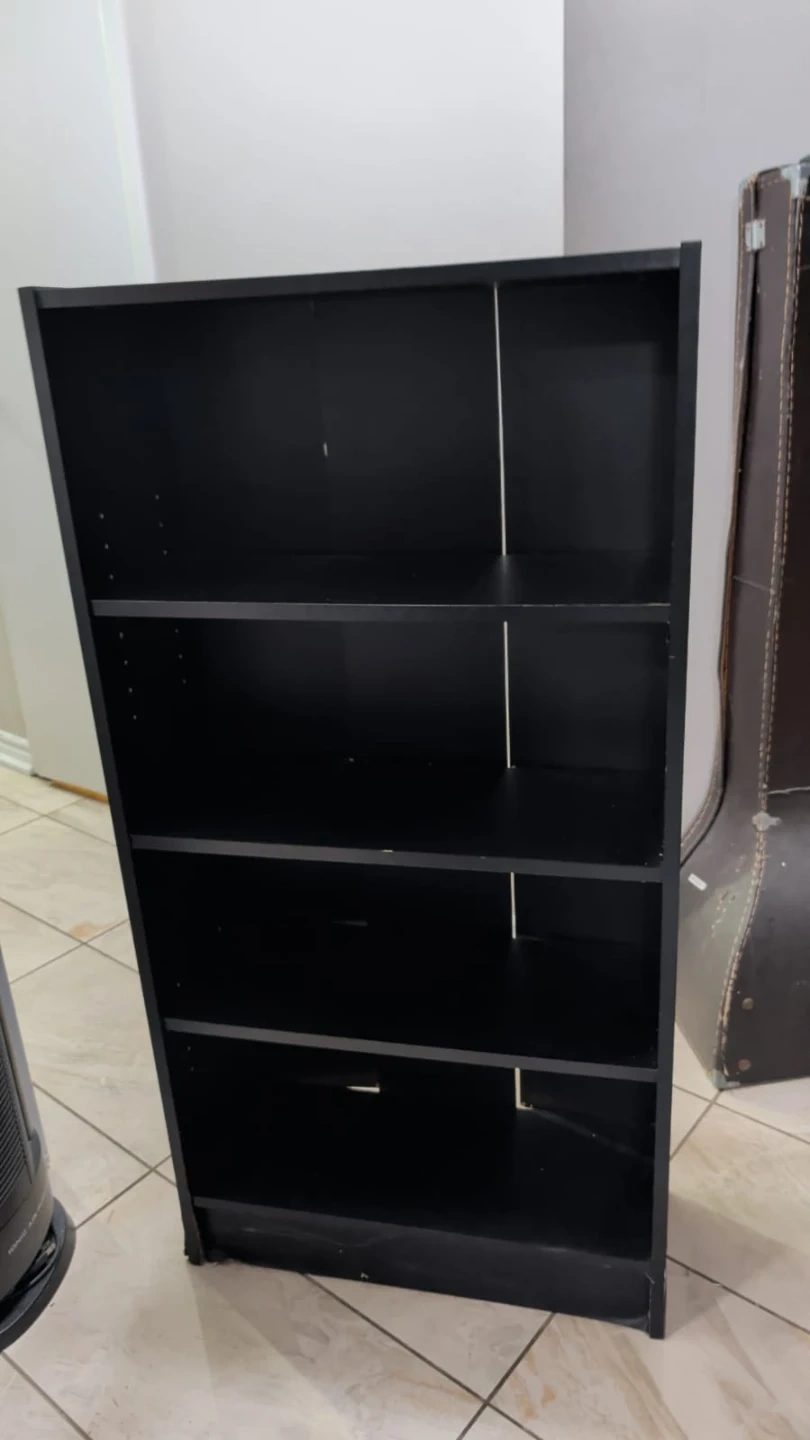 Selling a black bookshelf. It has four shelves and is in good condition. Perfect for storing books or displaying items! Height 47 inches length 24 inches width 9.5 inches