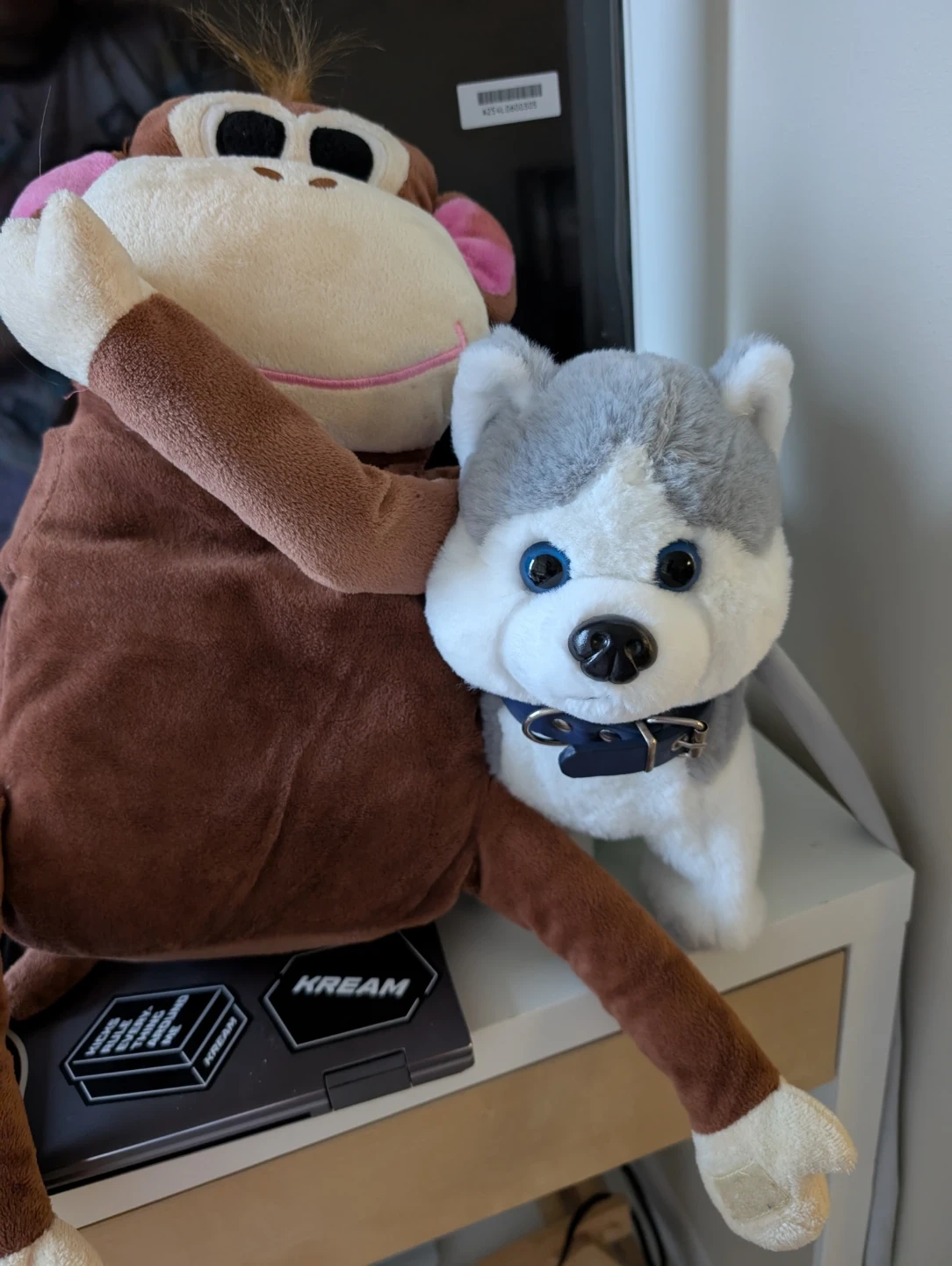 Two cute plush toys are up for grabs! There's a brown monkey and a grey and white husky. They're both in good condition and looking for a new home!