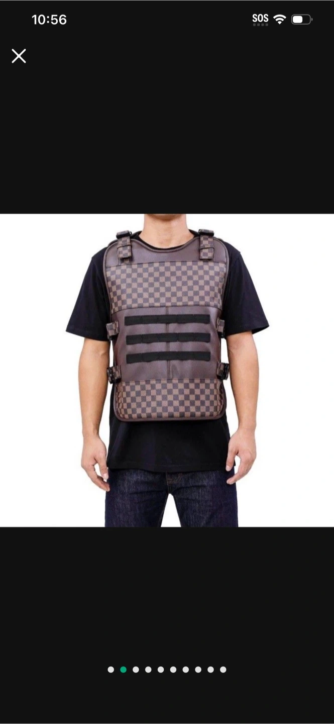 Here's a brown checkered tactical vest. It's a unique piece that could be used for cosplay or as a statement piece!