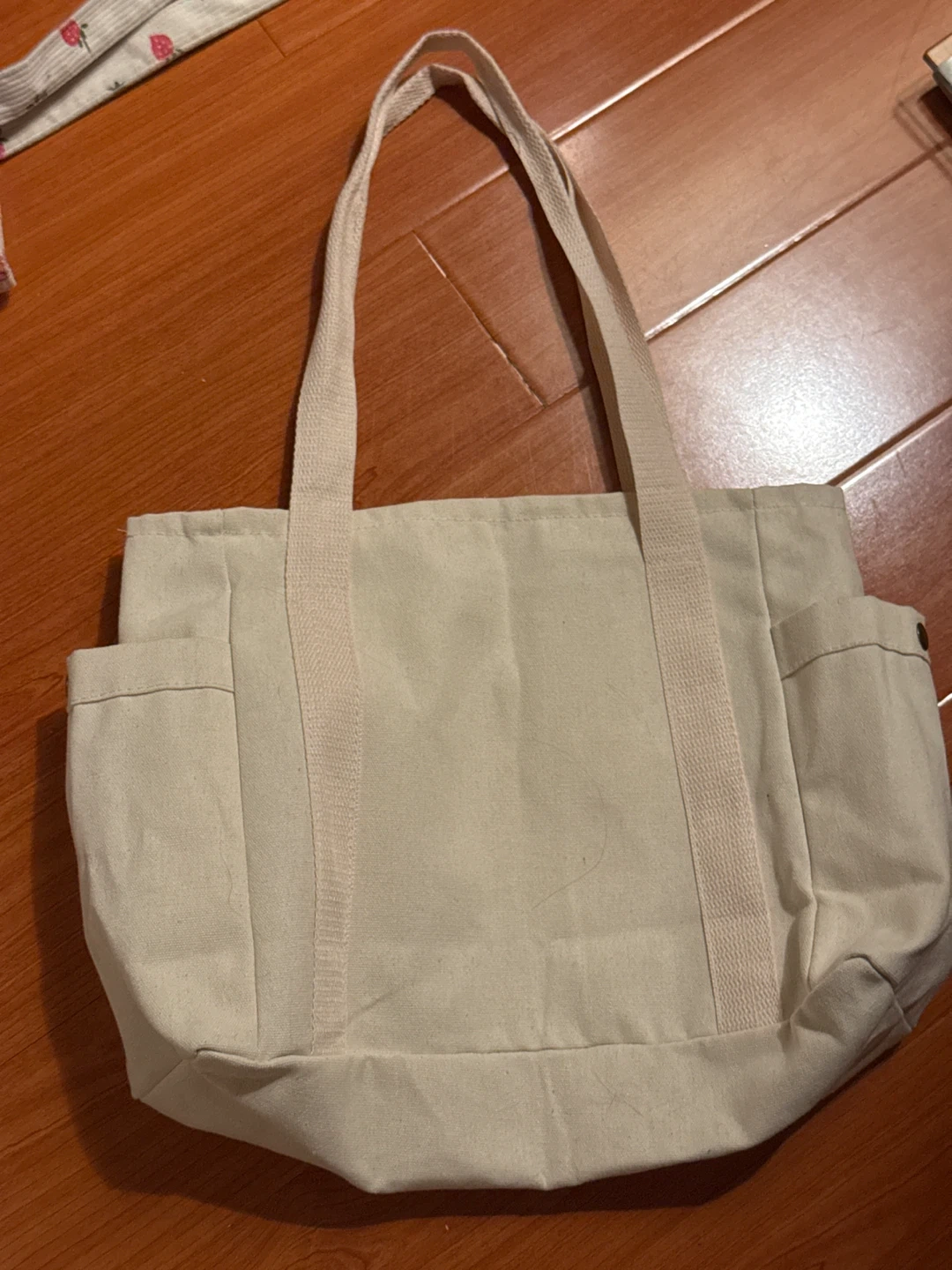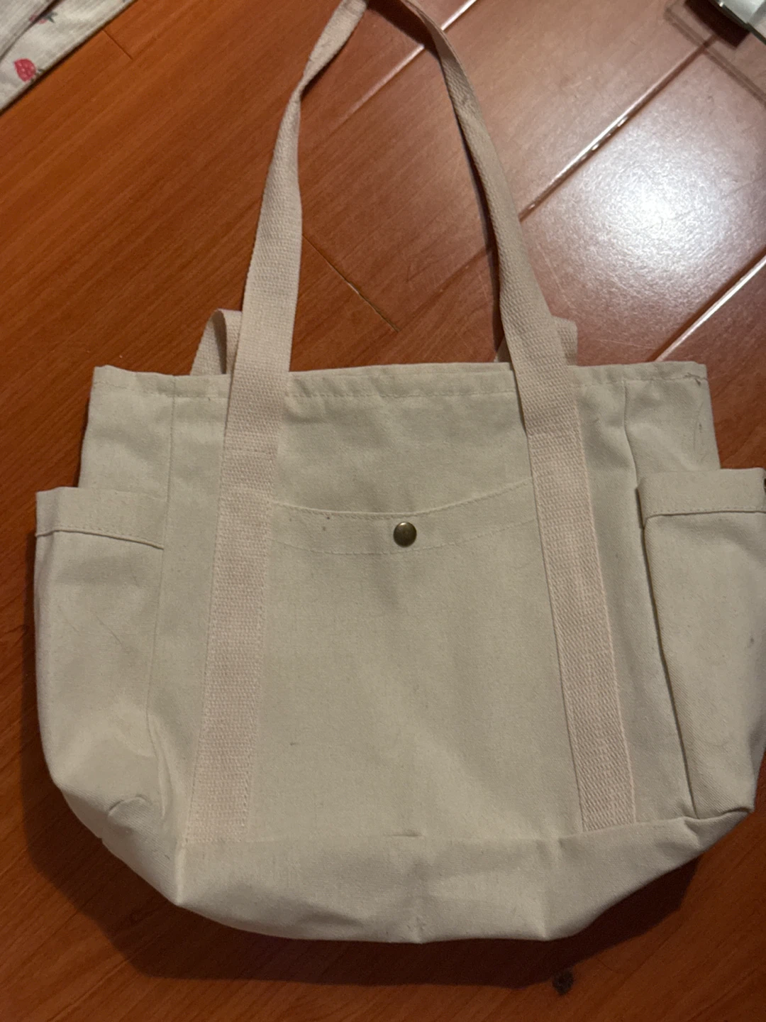 I'm selling a beige canvas tote bag. It's in great condition and perfect for everyday use. It features sturdy straps and convenient side pockets for extra storage