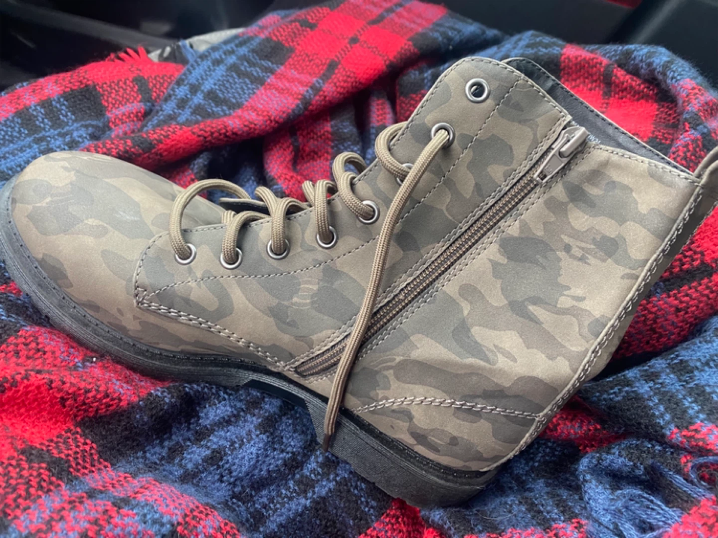 Selling a pair of camo ankle boots They feature a lace-up design with a side zipper for easy wear. Great for adding a stylish touch to any outfit!