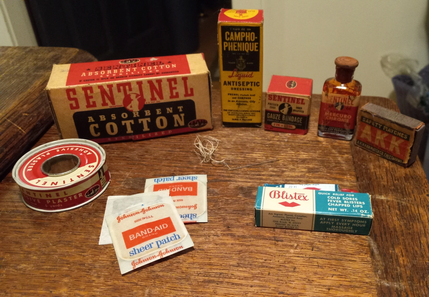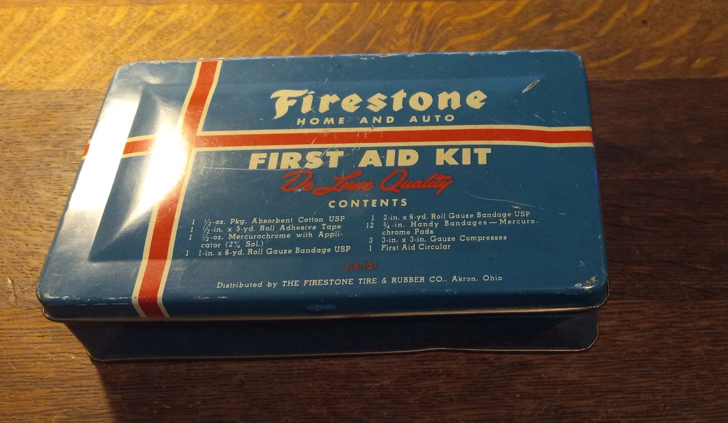 Firestone Tin retains 98% of its paint, has minor wear at edges. Old packages of contents inside - not all full. Small band-aids for head-on collisions. Not meant for future medical uses, but a branded antique.