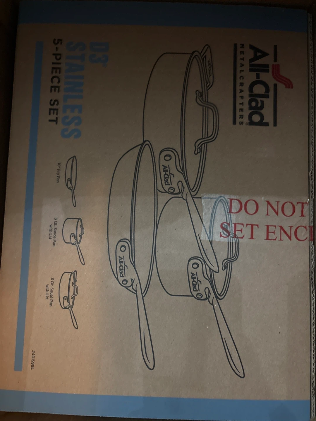 Selling an New All-Clad D3 Stainless 5-Piece Set! Included are a 10" fry pan, a 3 Qt sauce pan with lid, and a 3 Qt sauté pan with lid. This set is great for any kitchen!