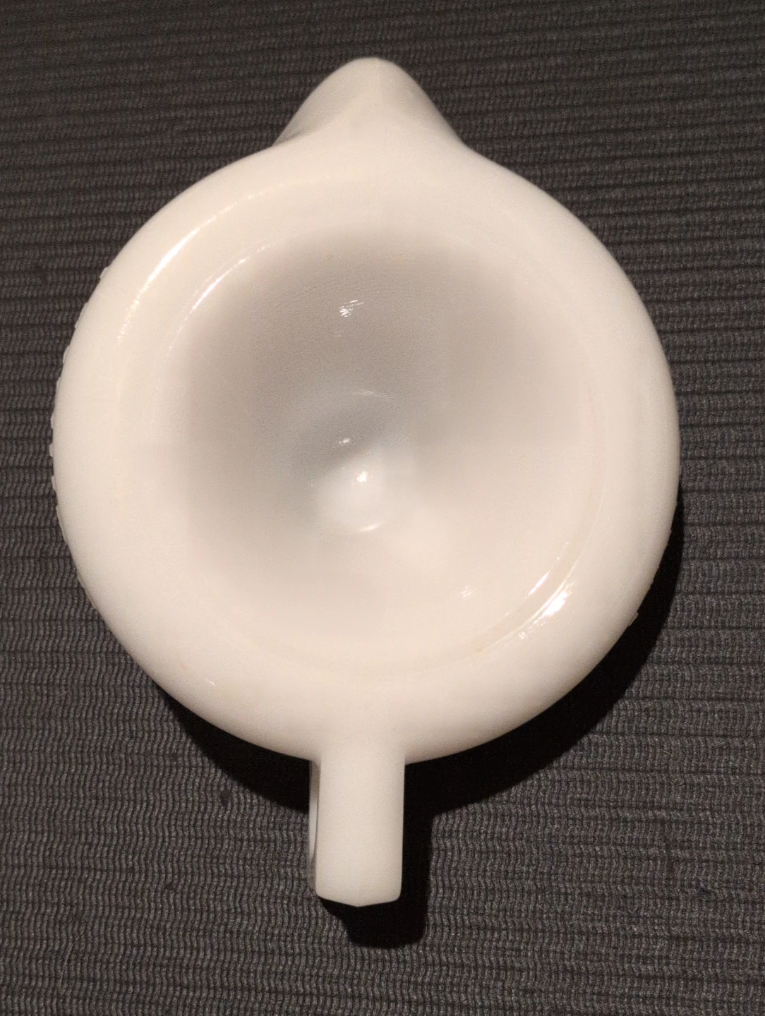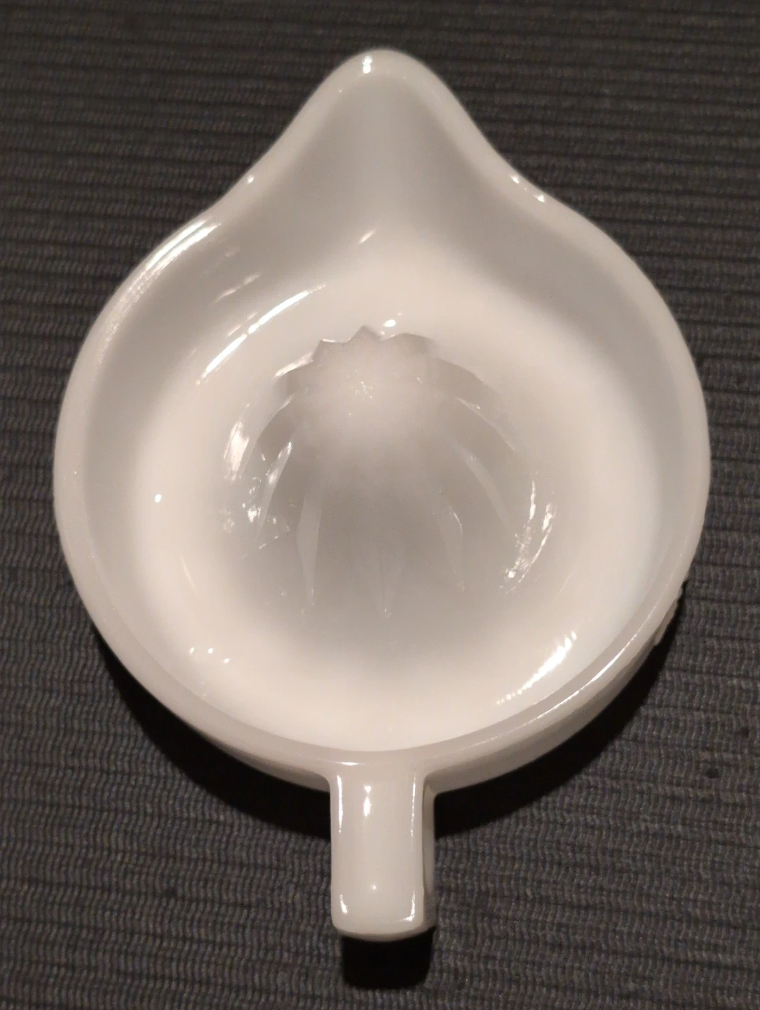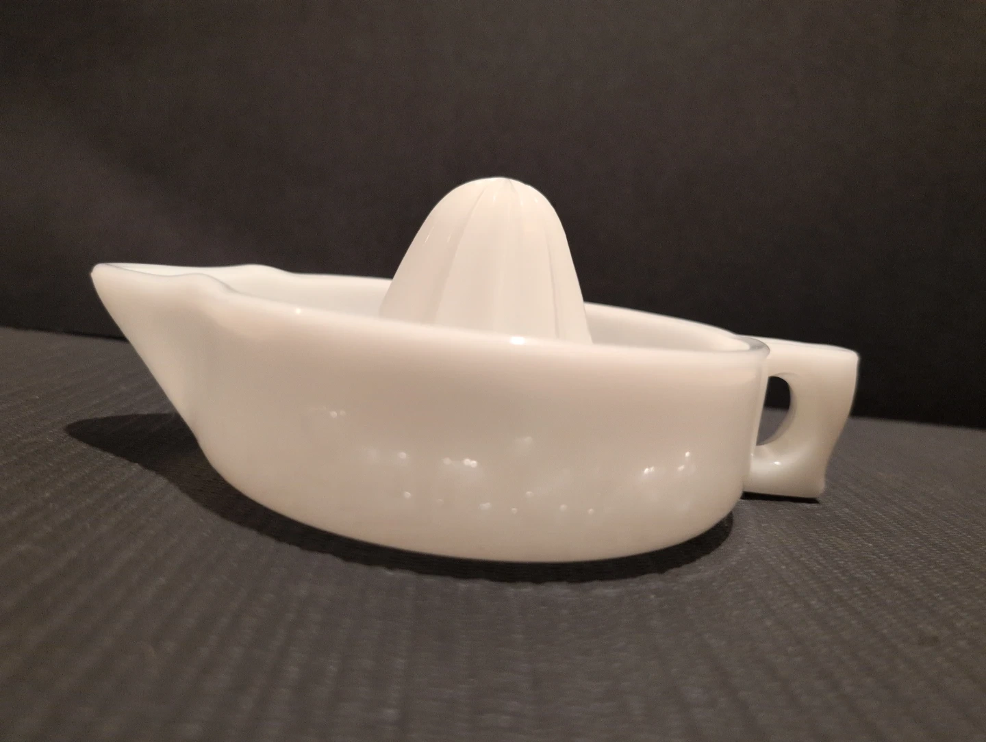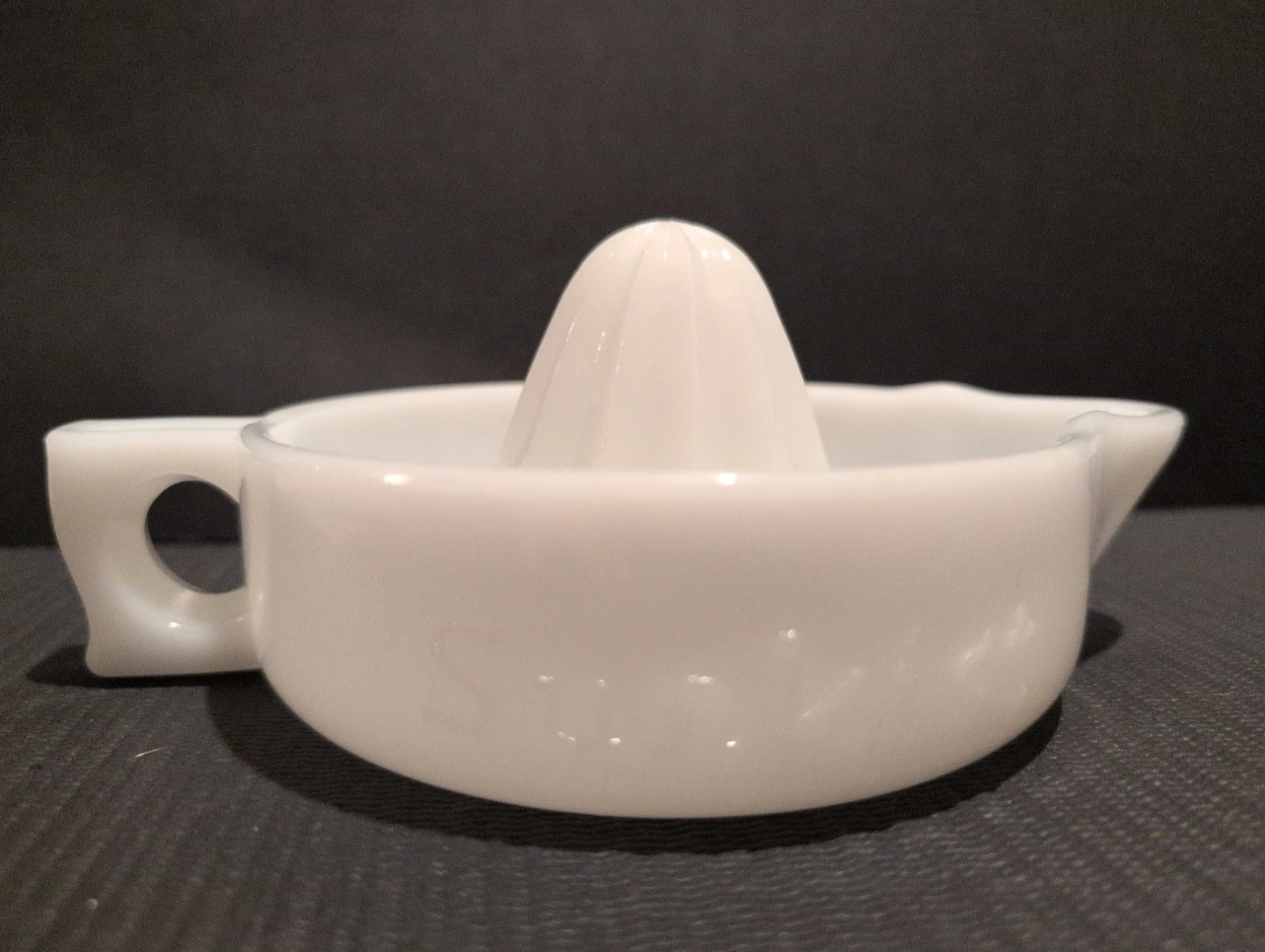 Selling a vintage Sunkist milk glass citrus juicer! It's in beautiful shape. This reamer has raised lips spout and a curved handle with bottom spur. The Sunkist name is embossed on both sides. 6" diameter, 3.25" height. It would look great in any kitchen and collection!