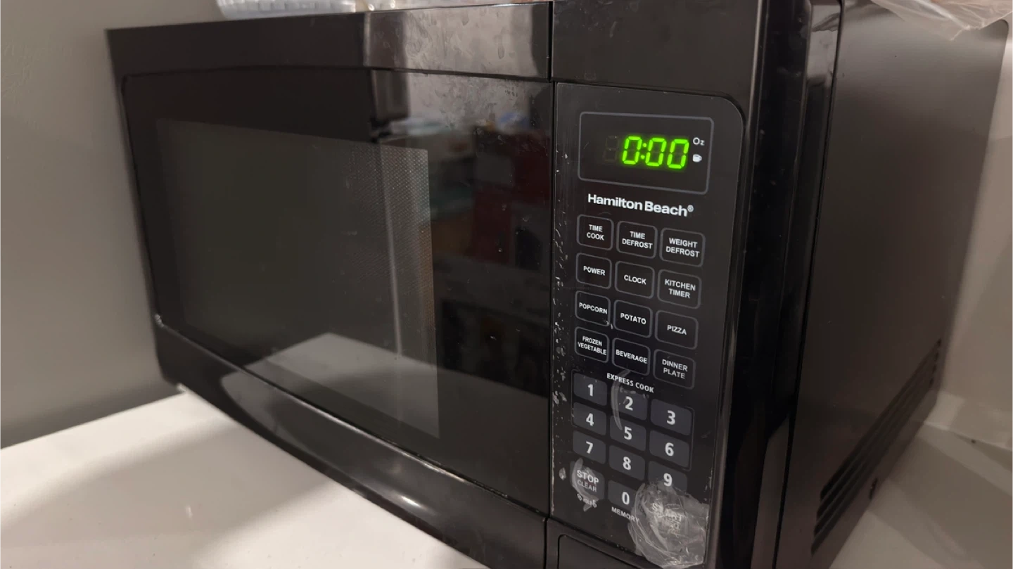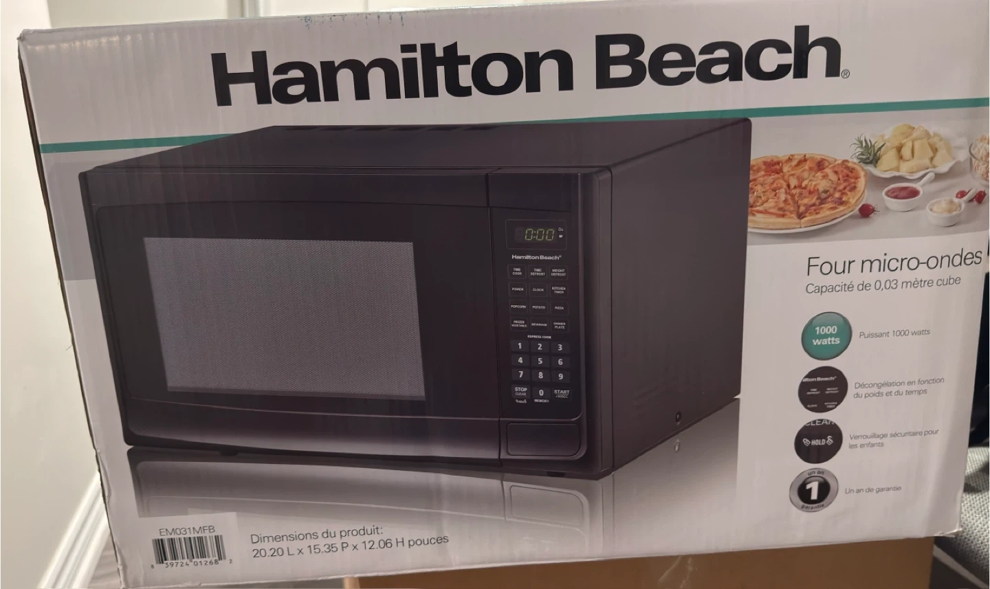 Selling a Hamilton Beach microwave in black. It's a great size for small spaces, with dimensions of 20.20 L x 15.35 P x 12.06 H pouces. It has a capacity of 0.03 metre cube and 1000 watts of power. The box is included!