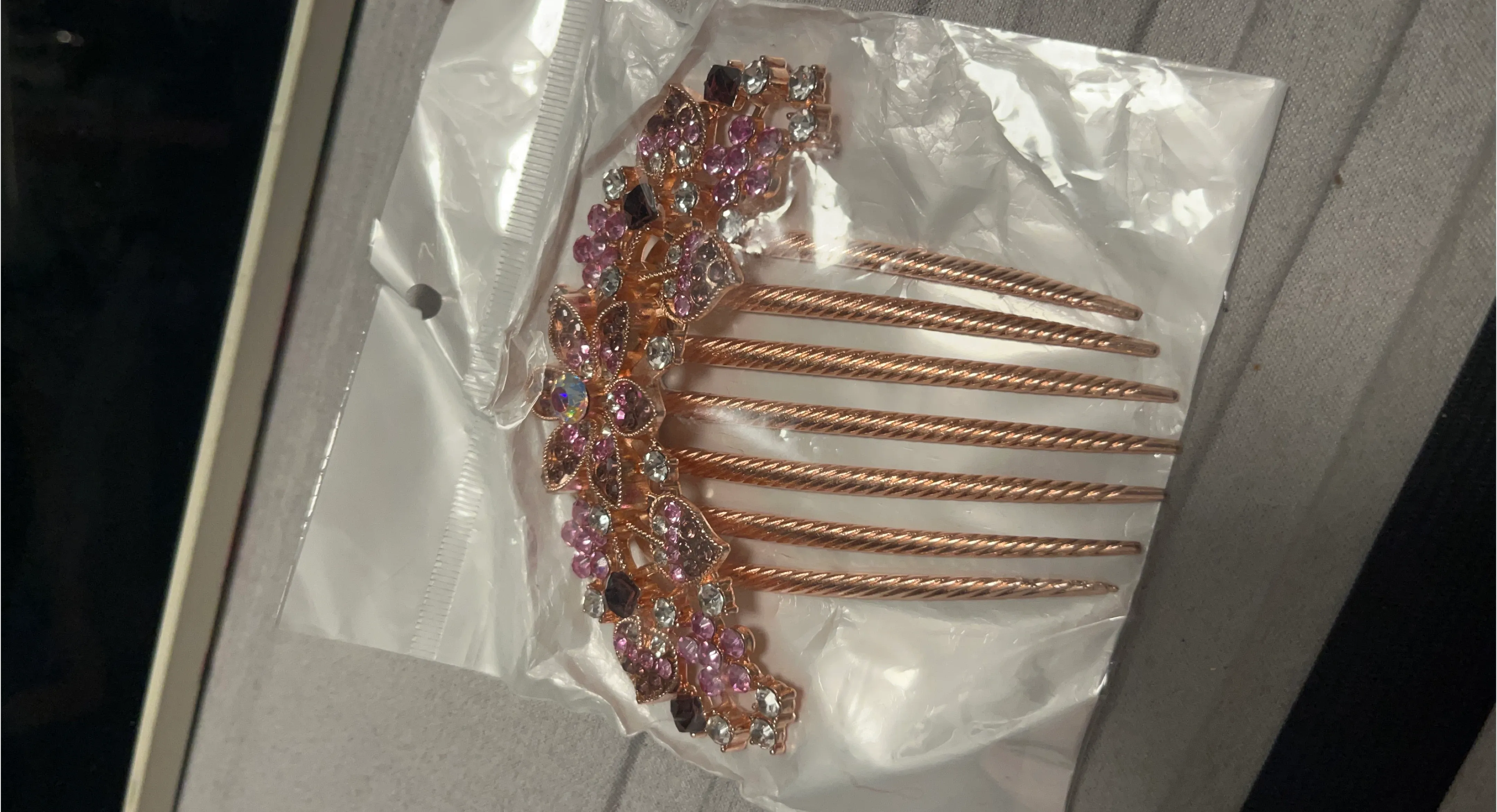 Selling a beautiful rhinestone hair comb accessory with a rose gold finish. It's brand new and still in its original packaging! The comb features lovely pink and clear rhinestones in a floral design. Perfect for adding a touch of sparkle to any hairstyle