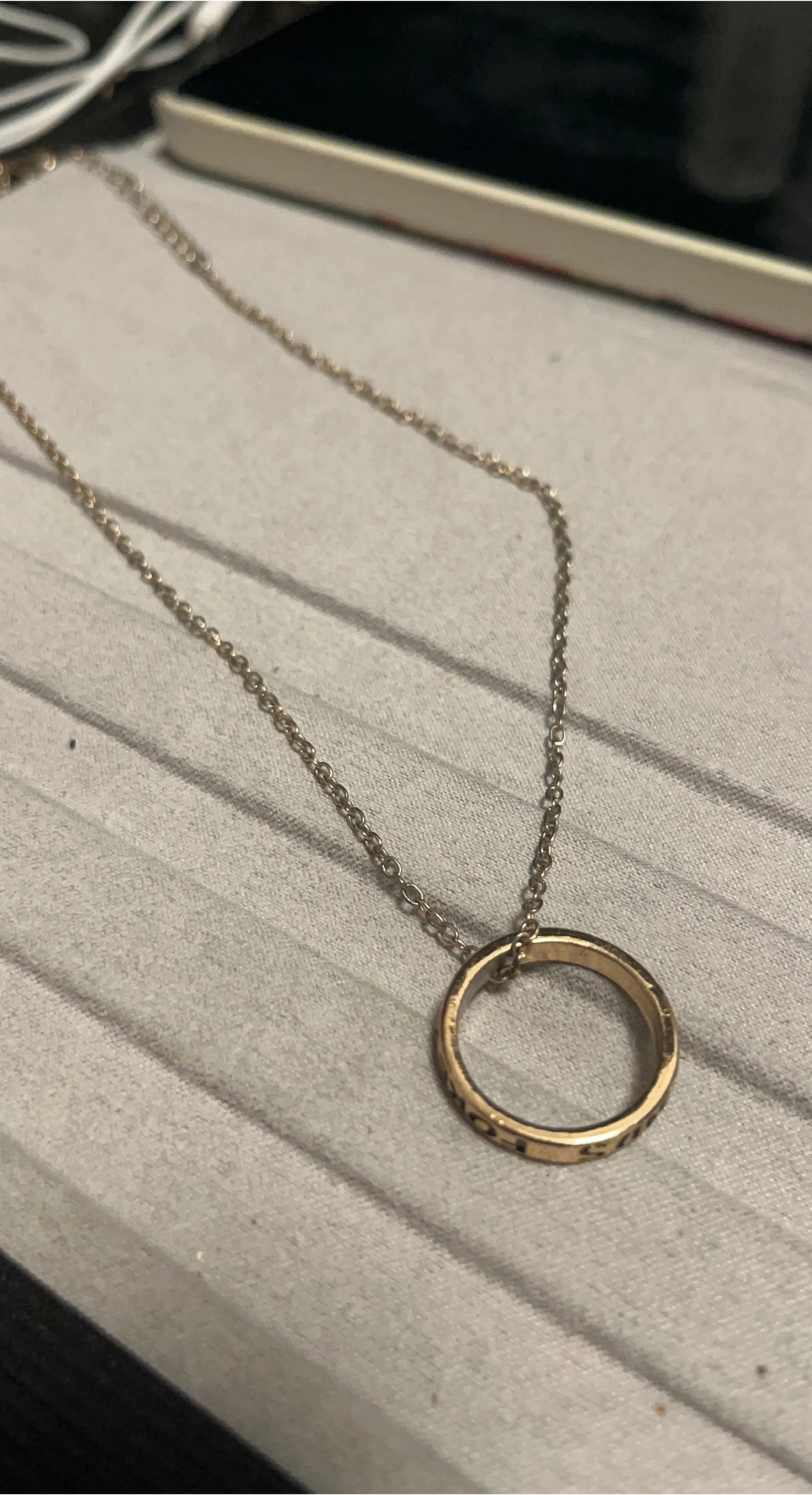 Selling a gold-coloured necklace with a ring pendant. The ring has some detailing on it. It's in good condition and ready for a new owner!