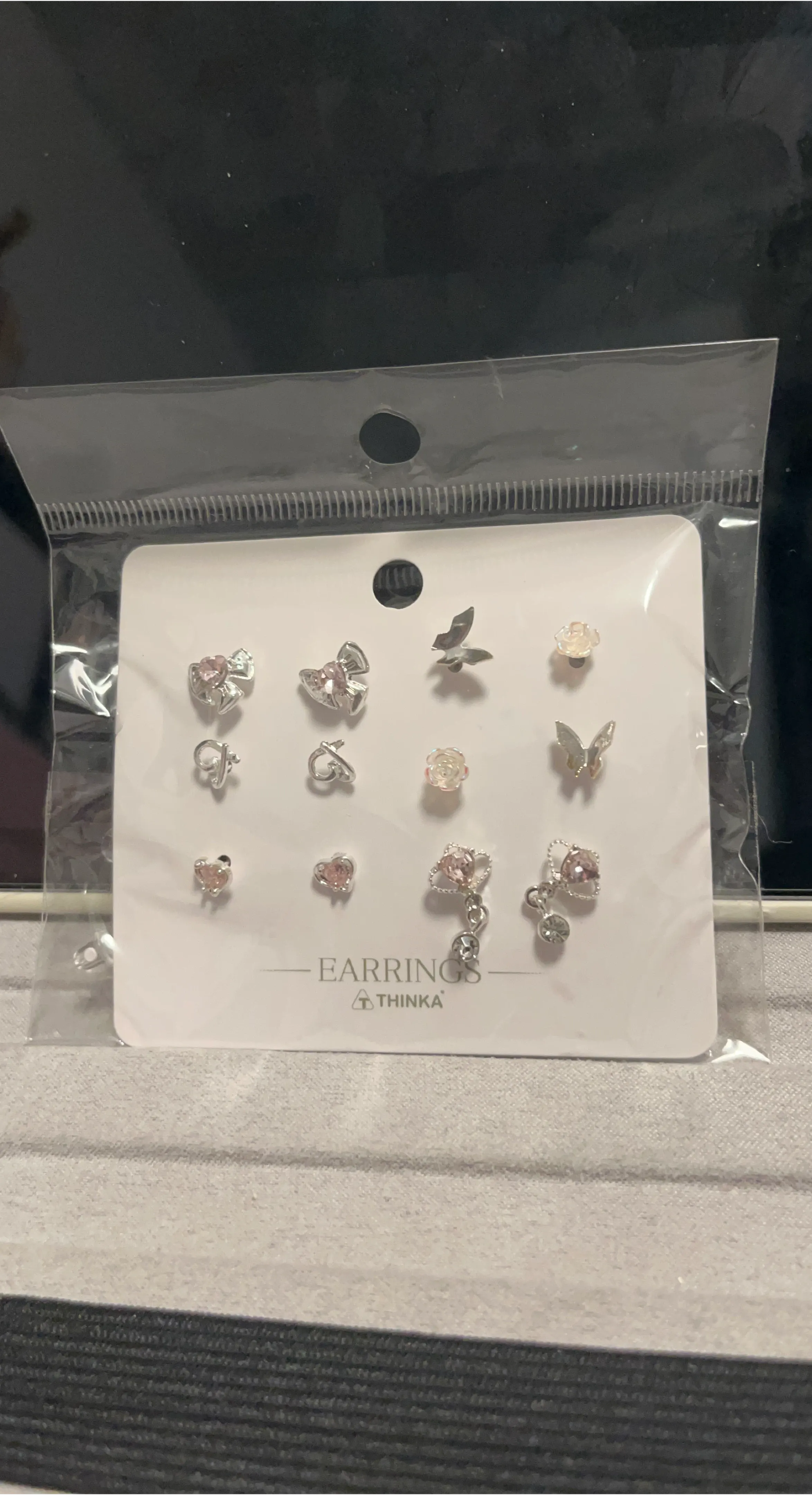Selling a brand new set of Thinka earrings! The set includes a variety of silver-toned earrings with different designs, including bows, hearts, butterflies, and roses. They are still in their original packaging