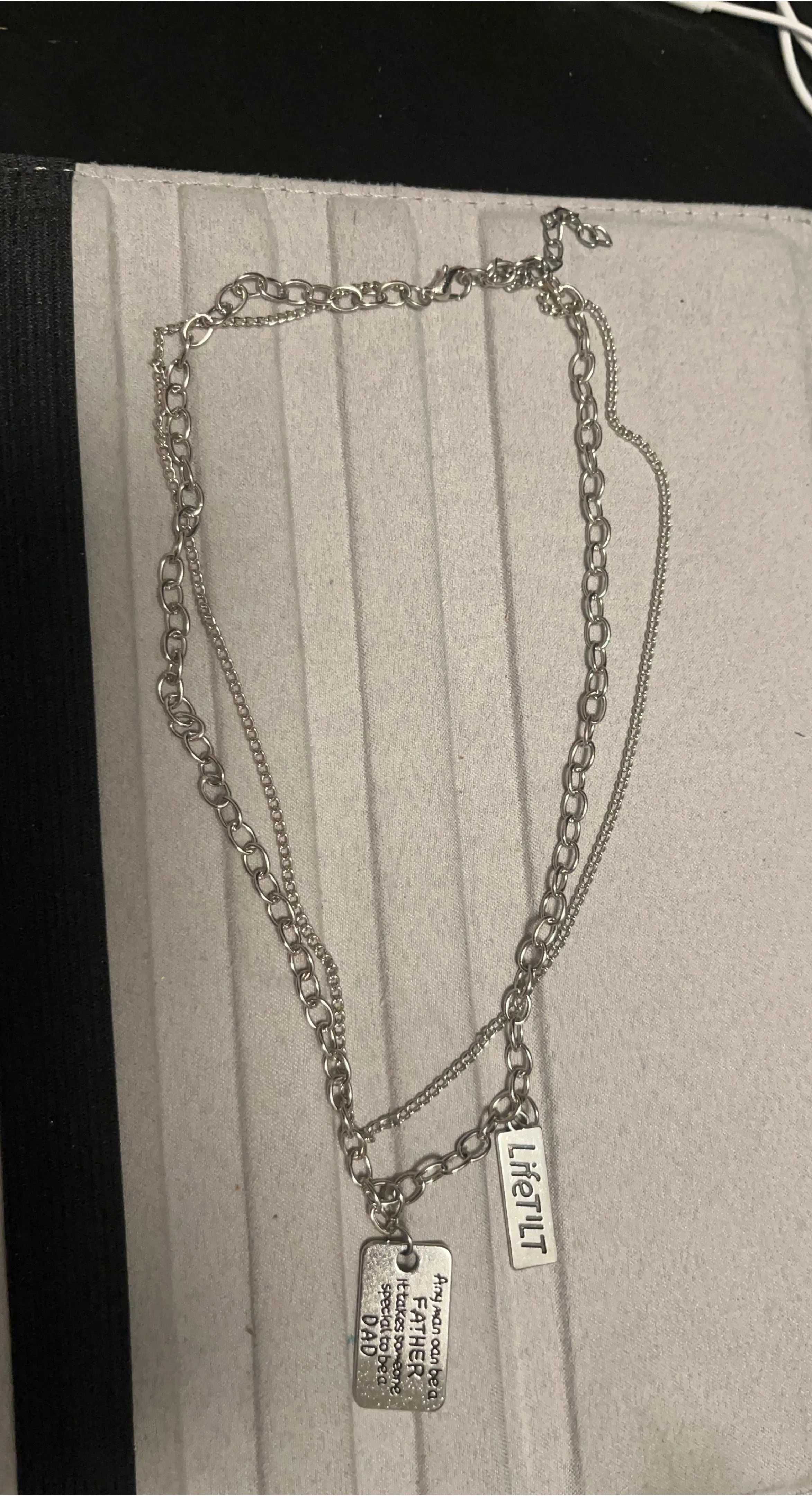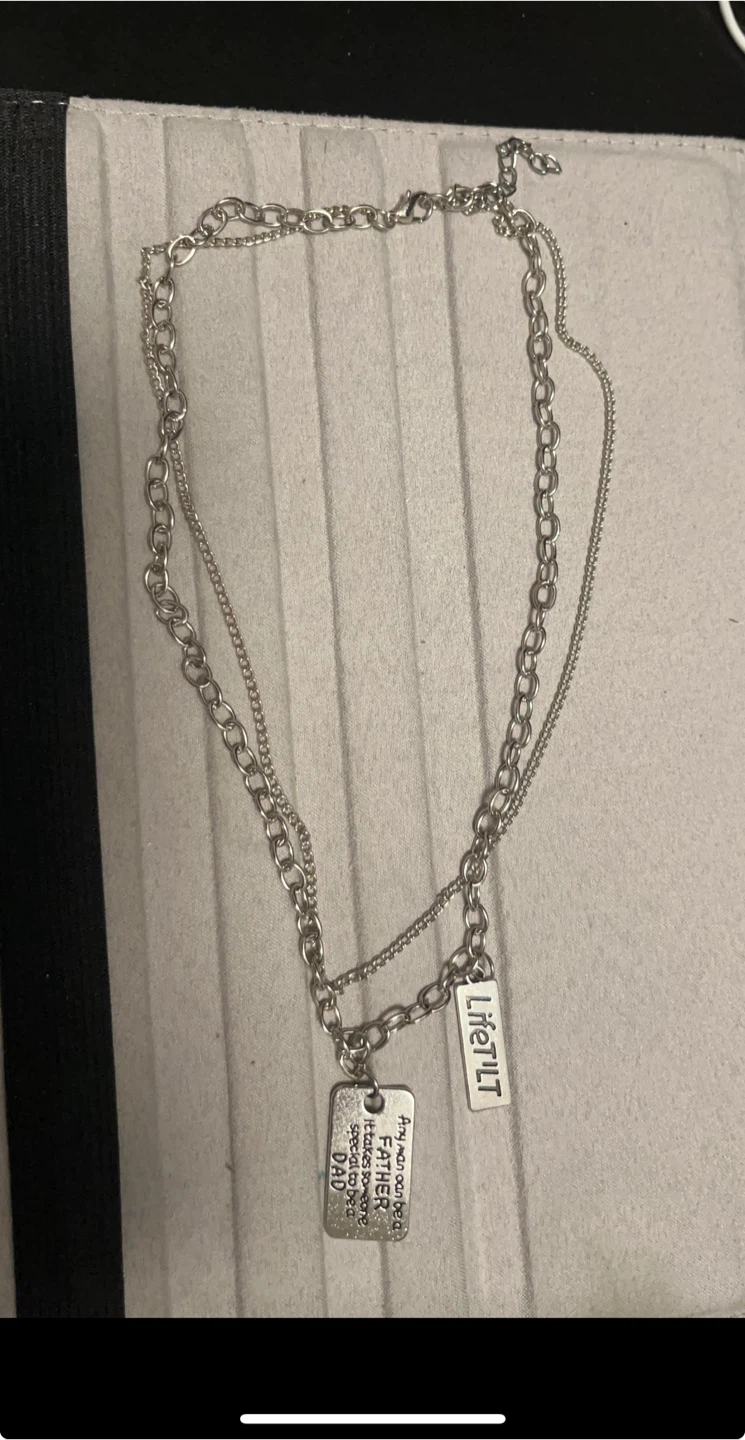 Selling a layered silver chain necklace. It features two pendants, one that says "Liferut" and another that says "Any man can be a FATHER, but it takes someone special to be a DAD"