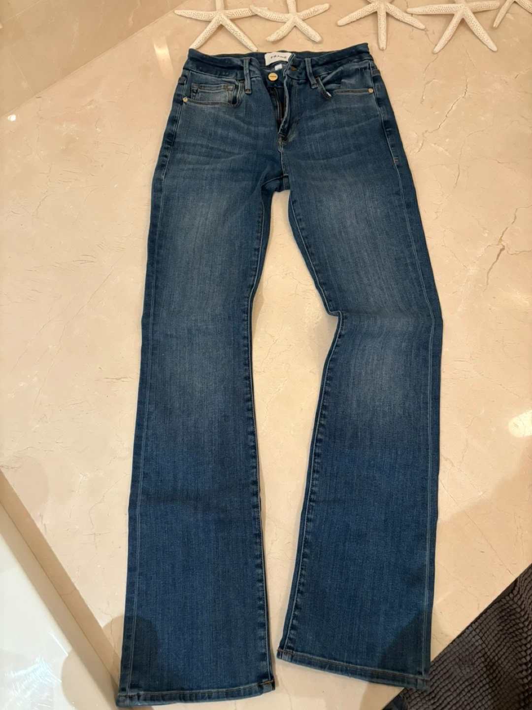 Selling a pair of FRAME denim jeans in size 25. These jeans are in great condition and ready for a new wardrobe! They're a classic denim wash that goes with everything.