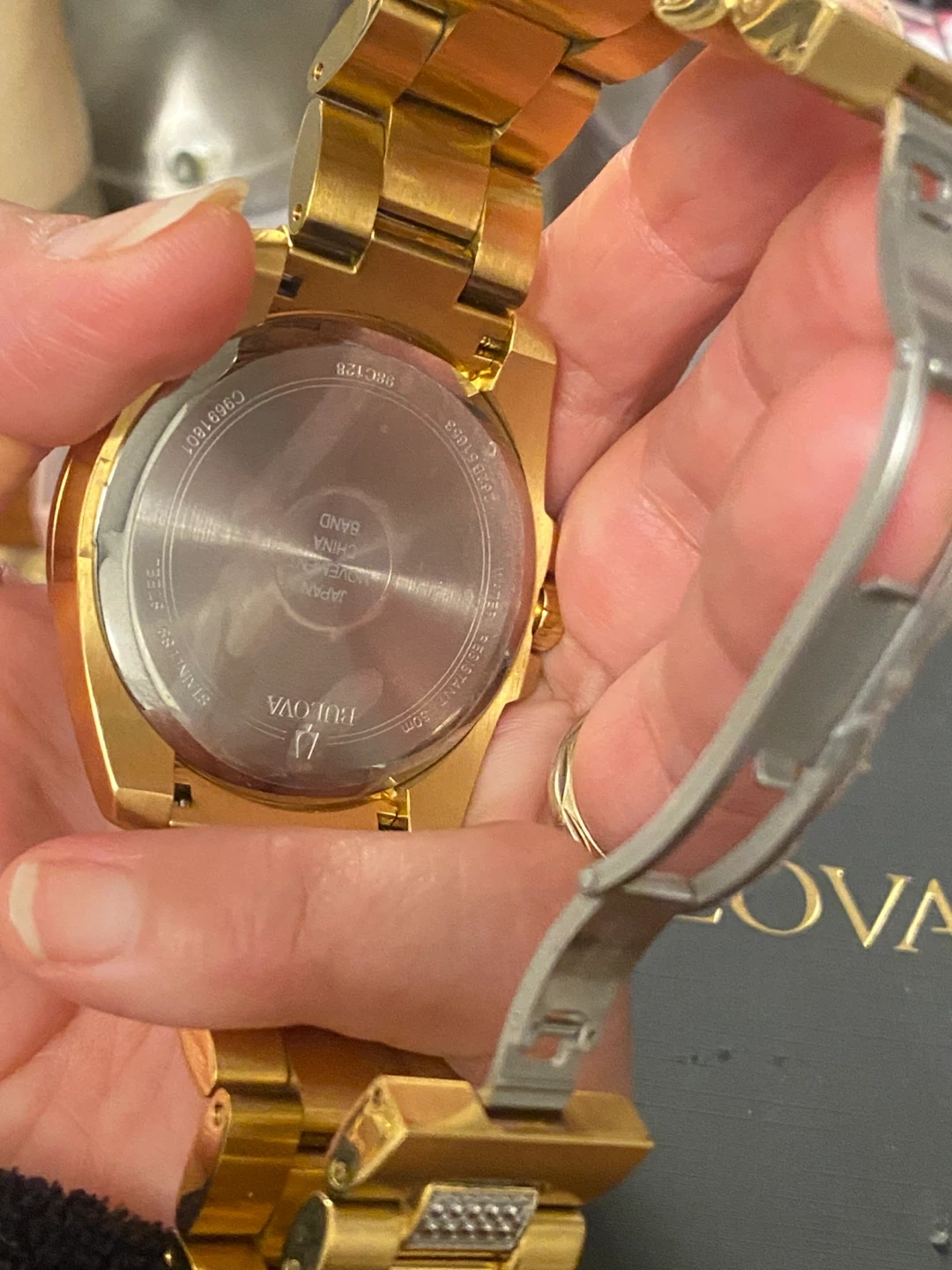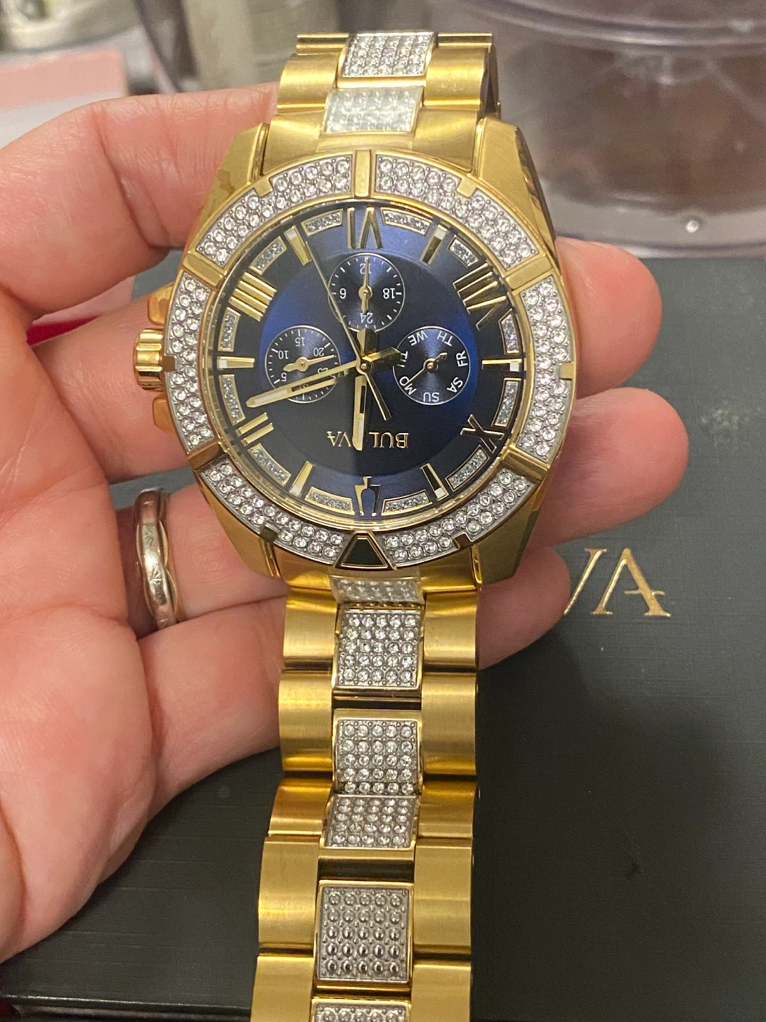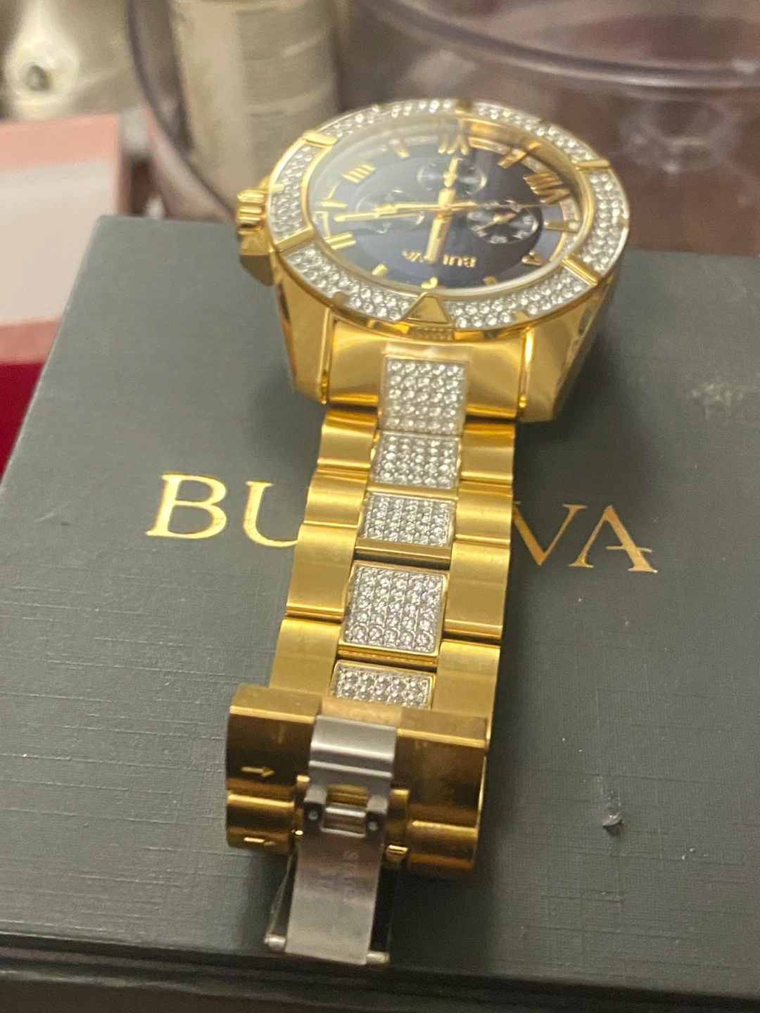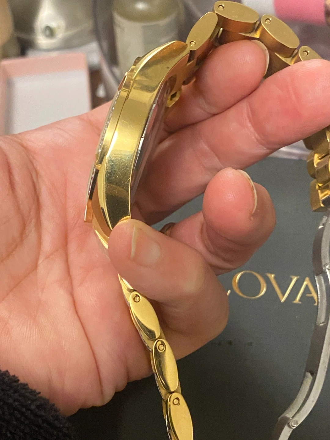 Selling a beautiful Bulova gold watch with diamond accents! It's in great condition and comes with extra links. This stylish timepiece is sure to turn heads!