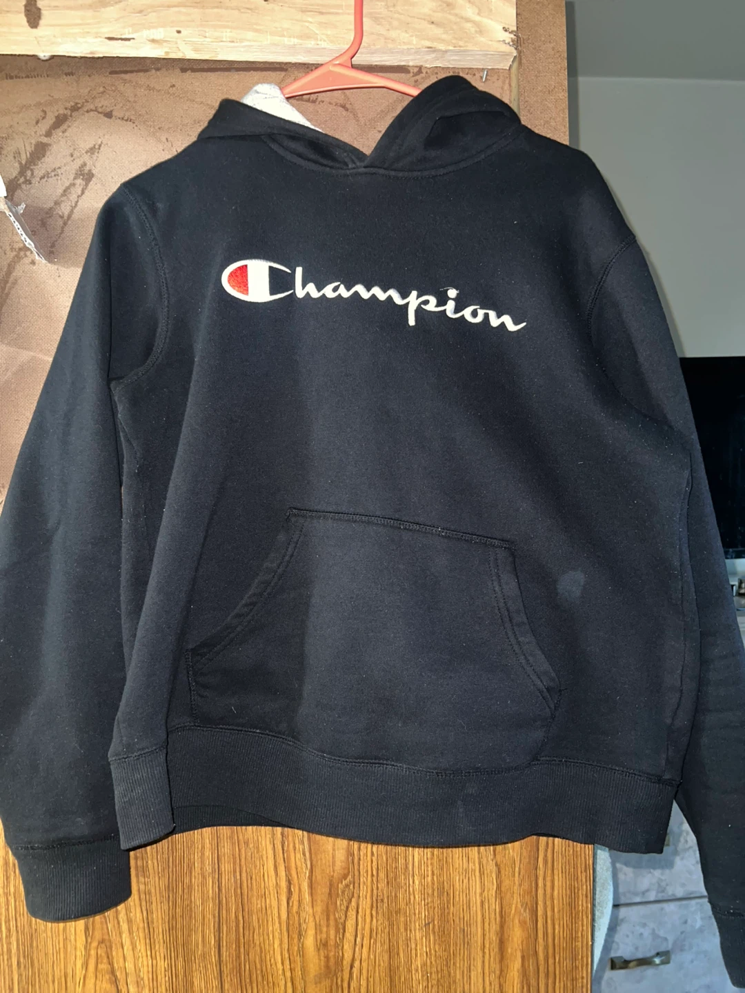 Preloved KIDS SIZE XL black Champion hoodie that I used to wear as a cropped sweater so it may be a lil stretched out and it also has a mark that should come out in the wash