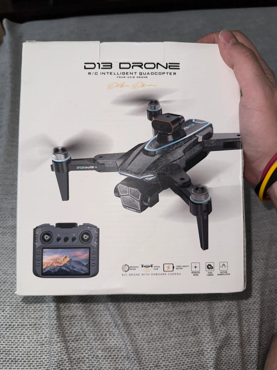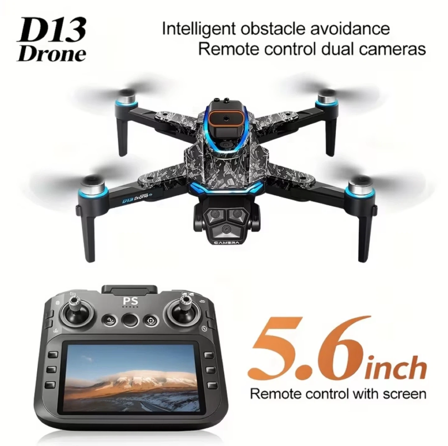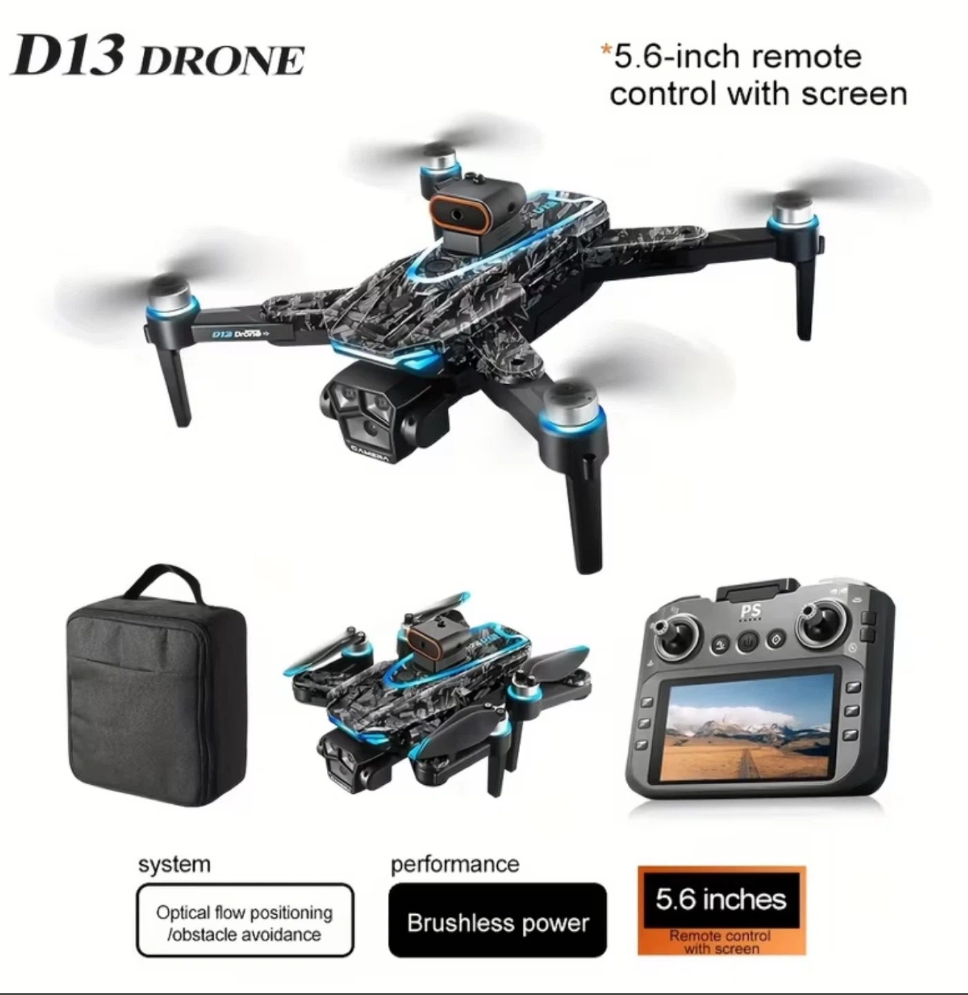 Selling a D13 Drone R/C Intelligent Quadcopter. It's new and comes with the original box. Features include optical flow positioning, obstacle avoidance, and a 5.6-inch remote control with screen. It also has brushless power and a pro-grade lens for stabilized shooting with a 90° remote control angle. Great for capturing amazing aerial footage
