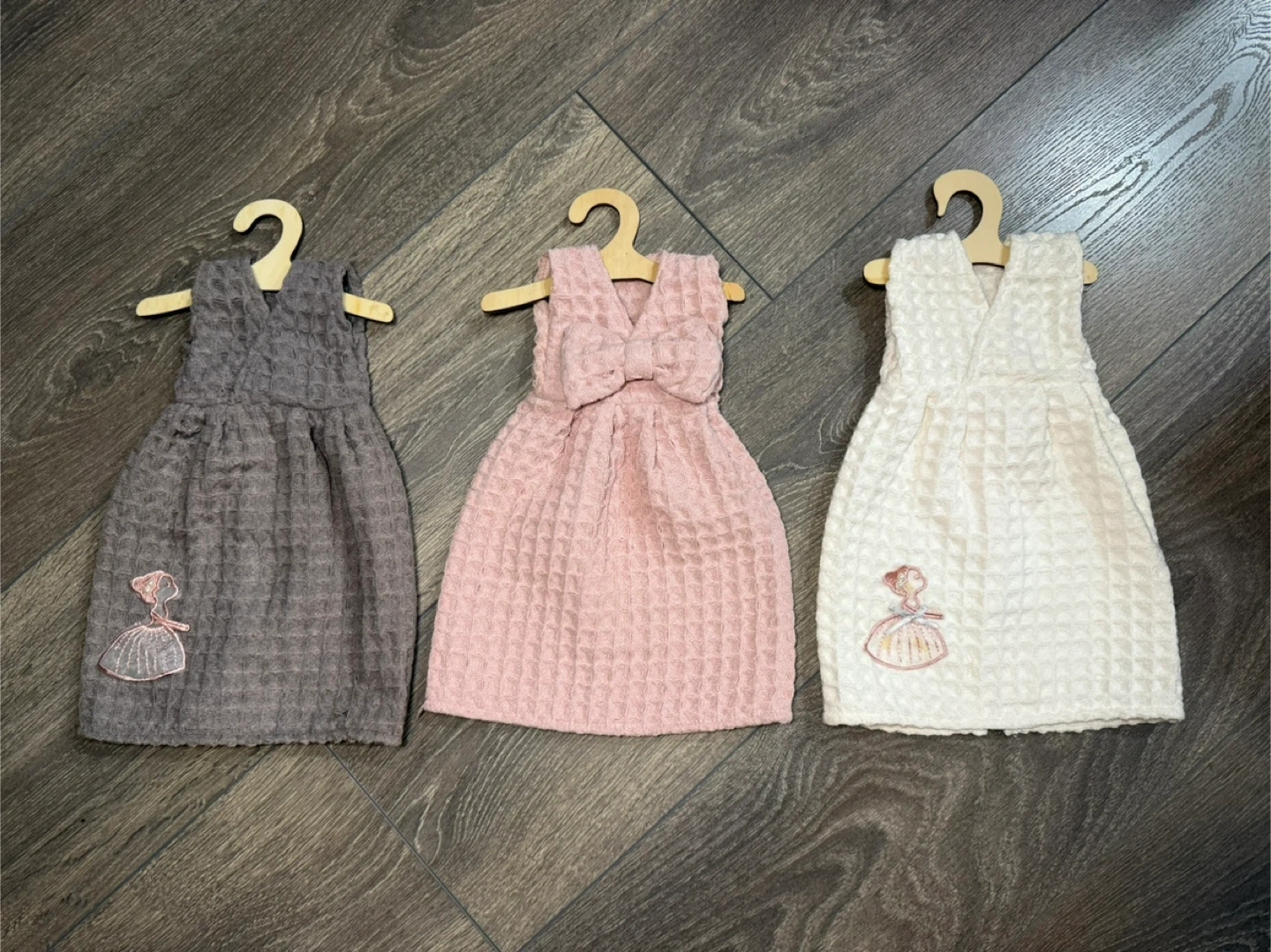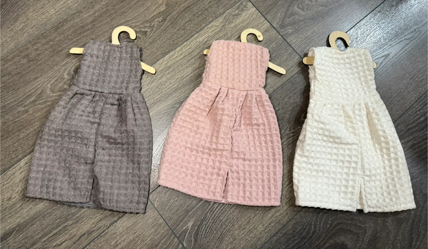 Here's a cute set of three Korean dress-shaped kitchen towels! They come in grey, pink, and white. The towels have a waffle texture and a little embroidered design on the front. Perfect for adding a touch of whimsy to your kitchen!