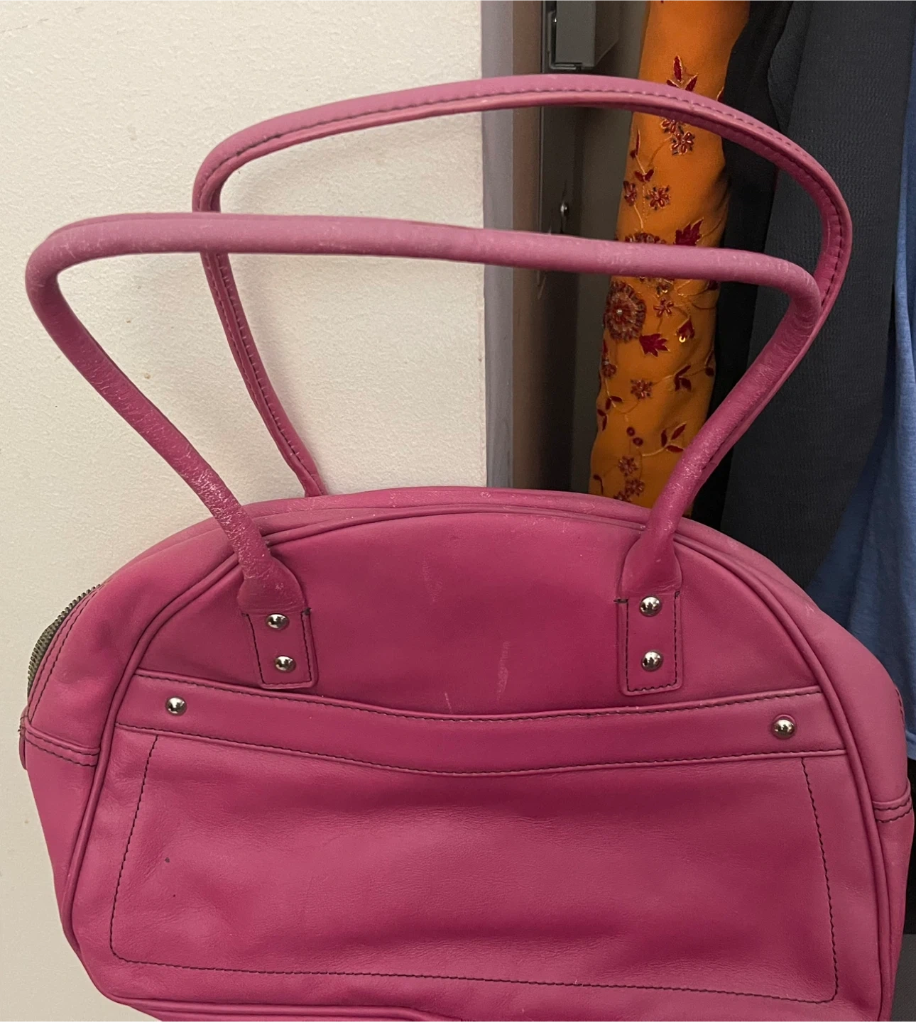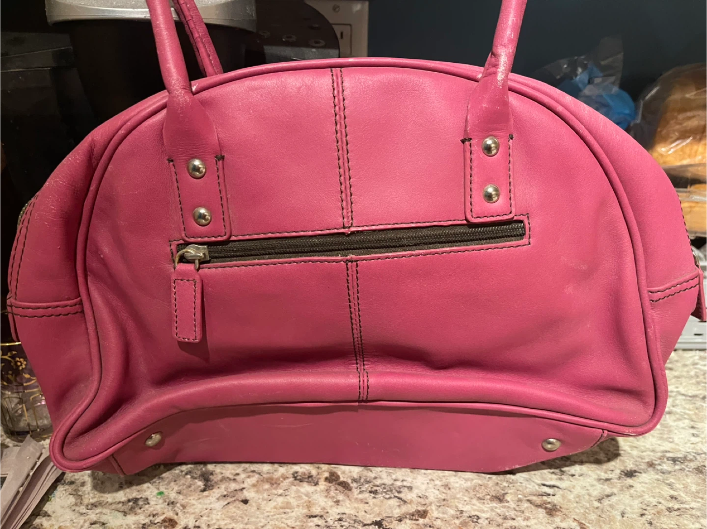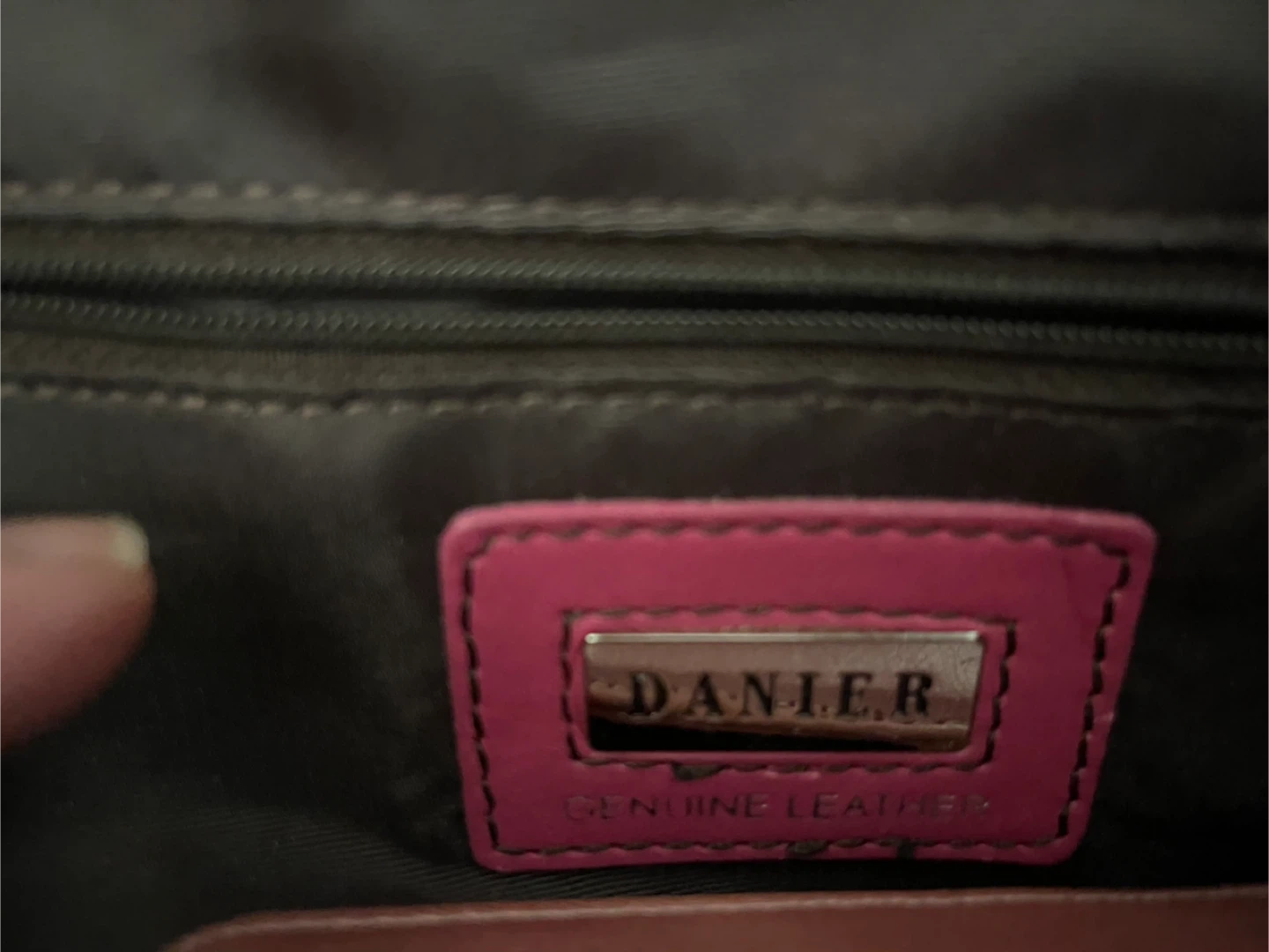 Selling a Danier handbag made of genuine leather! It's a lovely pink colour. There are some signs of wear, but it's still a great bag or purse to use. Side pockets on front and back.